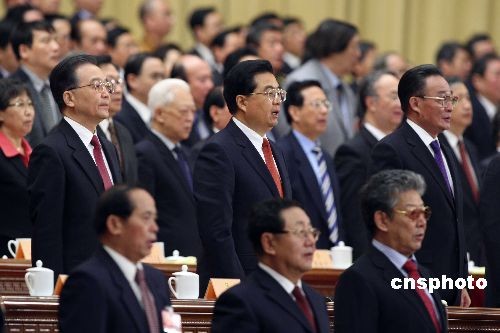3月12日,全國政協(xié)十一屆二次會(huì)議舉行閉幕大會(huì),胡錦濤、吳邦國、溫家寶等黨和國家領(lǐng)導(dǎo)人在閉幕式上唱國歌。中新社發(fā) 盛佳鵬 攝