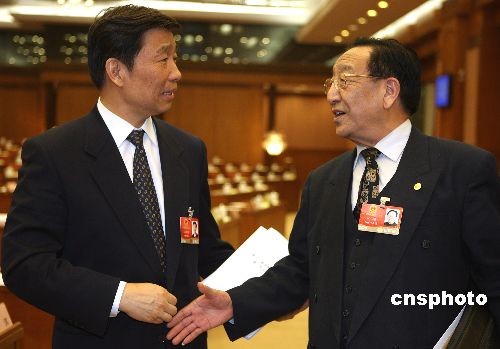 3月12日上午,十一屆全國人大二次會議第三次主席團會議在北京人民大會堂舉行。會議經過表決,決定將關于全國人大常委會工作報告的決議草案、關于最高人民法院工作報告的決議草案、關于最高人民檢察院工作報告的決議草案提請各代表團審議。主席團成員李源潮(左)、列確(西藏自治區(qū)人大常委會主任)出席。中新社發(fā) 任晨鳴 攝