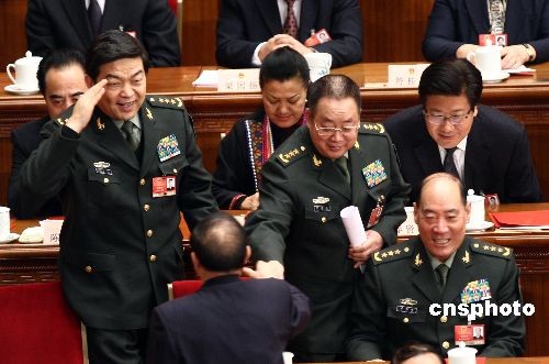 3月13日,第十一屆全國人民代表大會第二次會議在人民大會堂舉行閉幕會,解放軍代表在主席臺上互致問候。中新社發(fā) 杜洋 攝