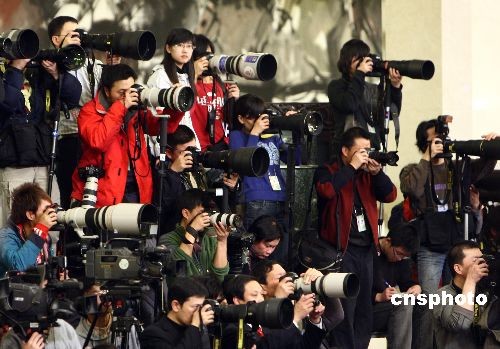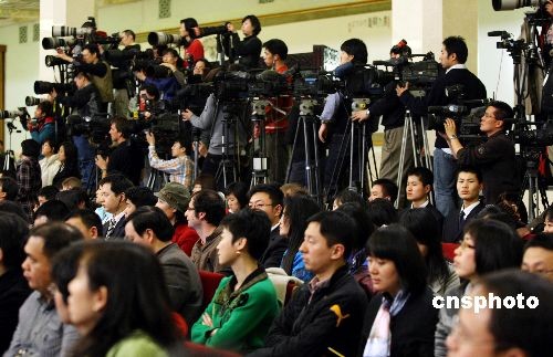 3月13日上午10時,國務(wù)院總理溫家寶應(yīng)十一屆全國人大二次會議大會發(fā)言人的邀請,在人民大會堂與采訪大會的中外記者見面并回答記者提出的問題。眾多攝影記者“長槍短炮”關(guān)注總理發(fā)布會。