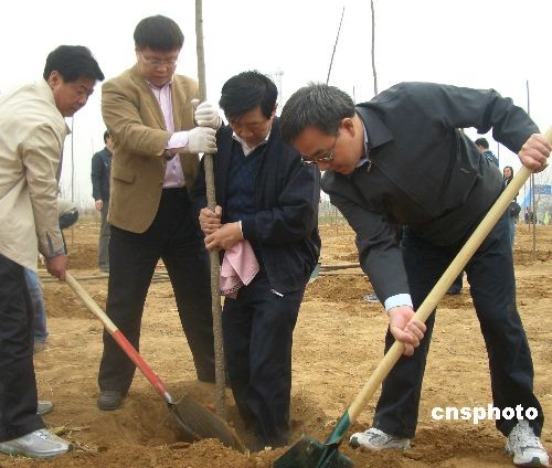 2009年3月21日,河北省及石家莊市黨政軍領(lǐng)導(dǎo)及省市四大辦公機關(guān)干部、部隊官兵1900人,在石家莊市鹿泉市山前大道韓莊生態(tài)林業(yè)基地,建設(shè)“省級領(lǐng)導(dǎo)紀(jì)念林”、“市級領(lǐng)導(dǎo)紀(jì)念林”、“駐石部隊紀(jì)念林”100多畝,栽植速生楊樹12000株,再一次掀起了省會造林綠化高潮。中新社發(fā) 俱凝搏 攝