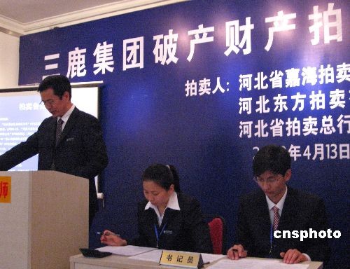 4月13日,由河北省嘉海拍賣有限公司作為主拍單位,與河北省東方拍賣有限公司、河北省拍賣總行有限公司共同進(jìn)行拍賣三鹿集團部分資產(chǎn)。當(dāng)日拍賣的11項破產(chǎn)財產(chǎn),競買人顯然無意出手,其中天津三鹿乳業(yè)51%的股權(quán)竟叫出20萬元的起拍價,最終也無人問津,三鹿集團第4批破產(chǎn)財產(chǎn)全部流拍。中新社發(fā) 翟羽佳 攝