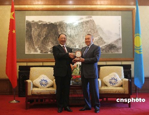 4月16日,中國國家體育總局局長、中國奧委會主席劉鵬在北京釣魚臺國賓館會見哈薩克斯坦總統(tǒng)納扎爾巴耶夫,并向納扎爾巴耶夫總統(tǒng)頒發(fā)中國奧委會勛章,以表示其對中國體育事業(yè)的支持。納扎爾巴耶夫此行是應(yīng)中國國家主席胡錦濤邀請,于15日傍晚抵達北京,開始對中國進行為期5天的國事訪問。訪華期間,納扎爾巴耶夫?qū)⑴c中國國家主席胡錦濤、全國人大常委會委員長吳邦國和國務(wù)院總理溫家寶進行會見,他還將出席博鰲亞洲論壇2009年年會,這是納扎爾巴耶夫2005年連任總統(tǒng)以來第2次對中國進行國事訪問。中新社發(fā) 富田 攝