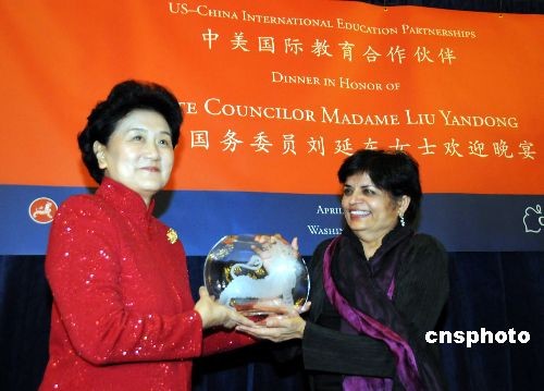 正在美國(guó)訪問(wèn)的國(guó)務(wù)委員劉延?xùn)|當(dāng)?shù)貢r(shí)間十六日晚出席了美亞洲協(xié)會(huì)和大學(xué)理事會(huì)聯(lián)合舉辦的晚宴,就中美關(guān)系和兩國(guó)人文交流發(fā)表講話。美亞洲協(xié)會(huì)和大學(xué)理事會(huì)還分別向劉延?xùn)|頒發(fā)各自的最高榮譽(yù)獎(jiǎng)。圖為美國(guó)亞洲協(xié)會(huì)會(huì)長(zhǎng)丁文嘉向劉延?xùn)|頒發(fā)該會(huì)最高榮譽(yù)獎(jiǎng)。中新社發(fā) 吳慶才 攝