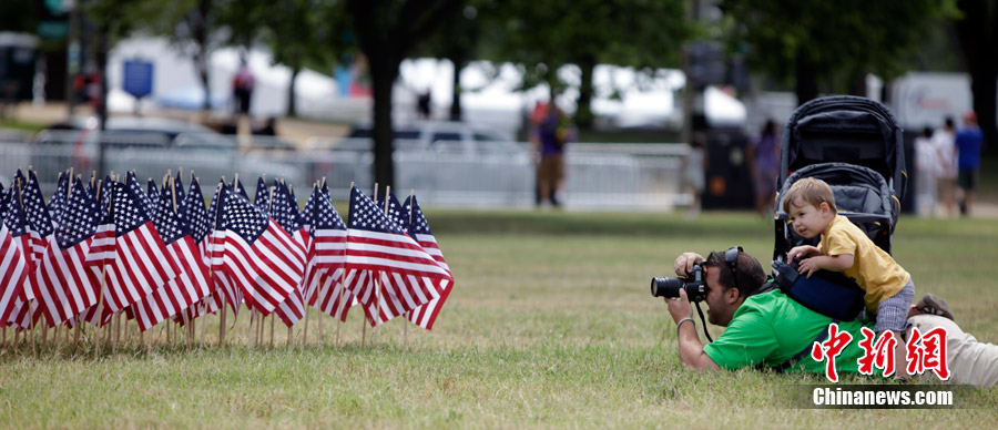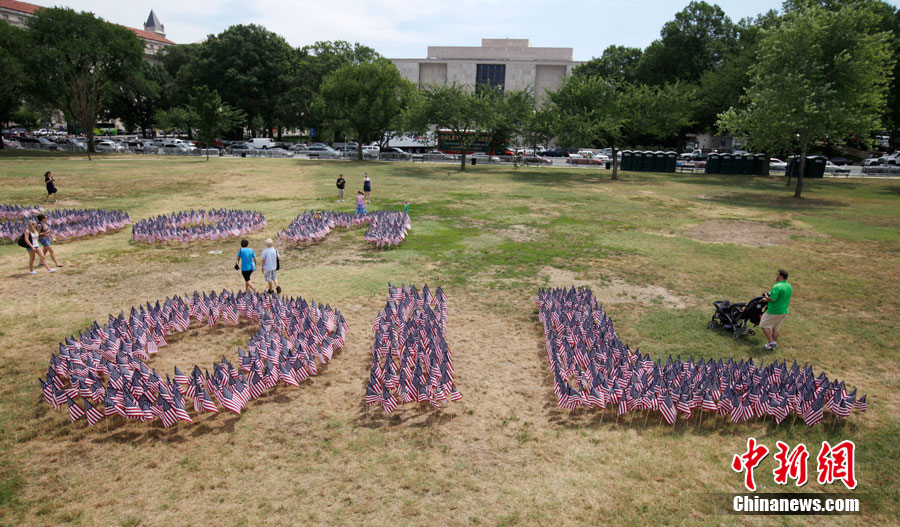 2010年6月30日,美國華盛頓,環(huán)保組織塞拉俱樂部的成員將數(shù)千面美國國旗插成“擺脫石油”(Freedom From Oil)的字樣,抗議墨西哥灣漏油事件。