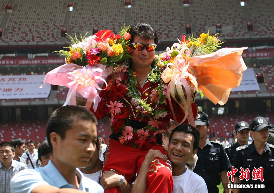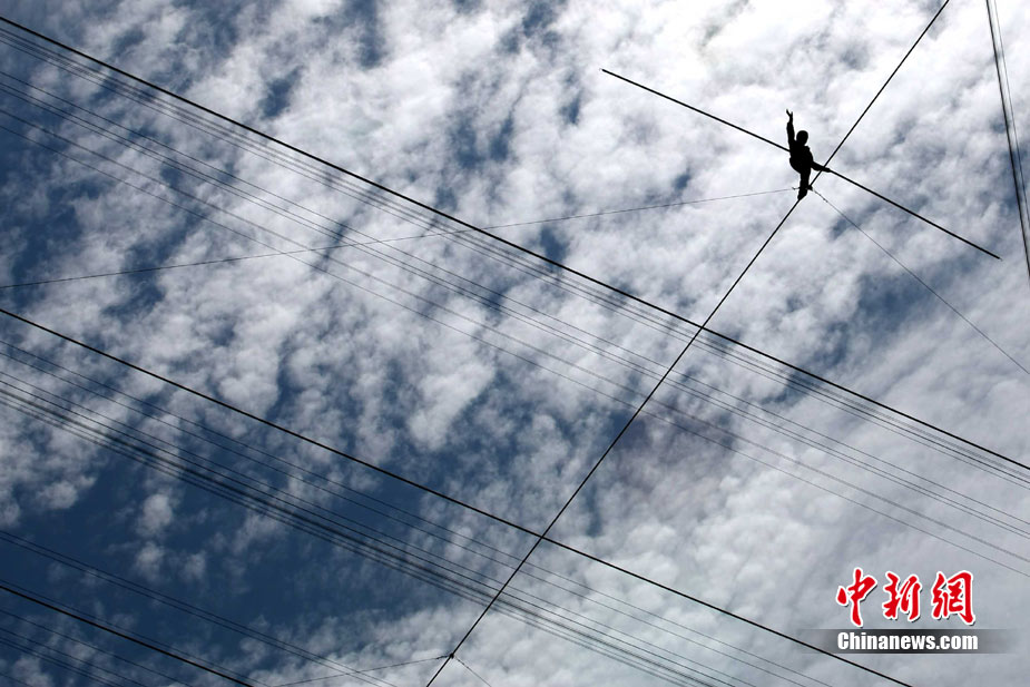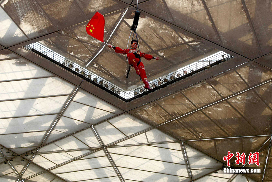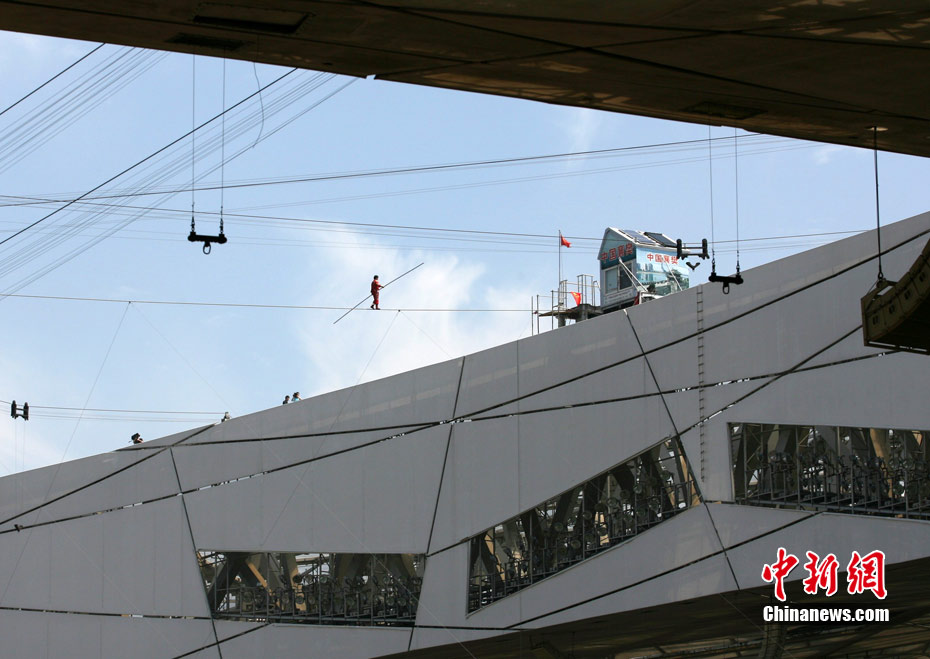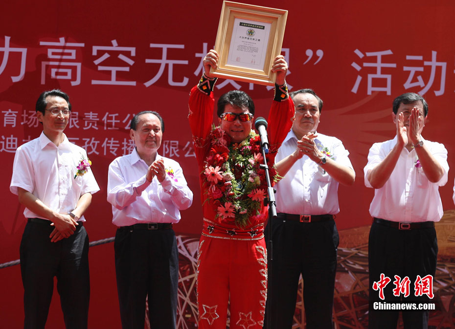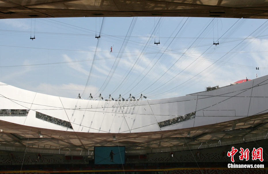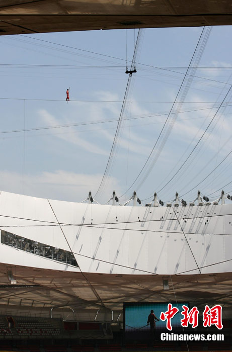 7月2日,在鳥巢上空艱難生活60天之后,高空王子阿迪力告別鳥巢回到地面,同時創(chuàng)造了60天累計連續(xù)走綱絲時間最長吉尼斯世界紀錄。圖為阿迪力用吊威亞的方式回到地面。中新社發(fā) 富田 攝