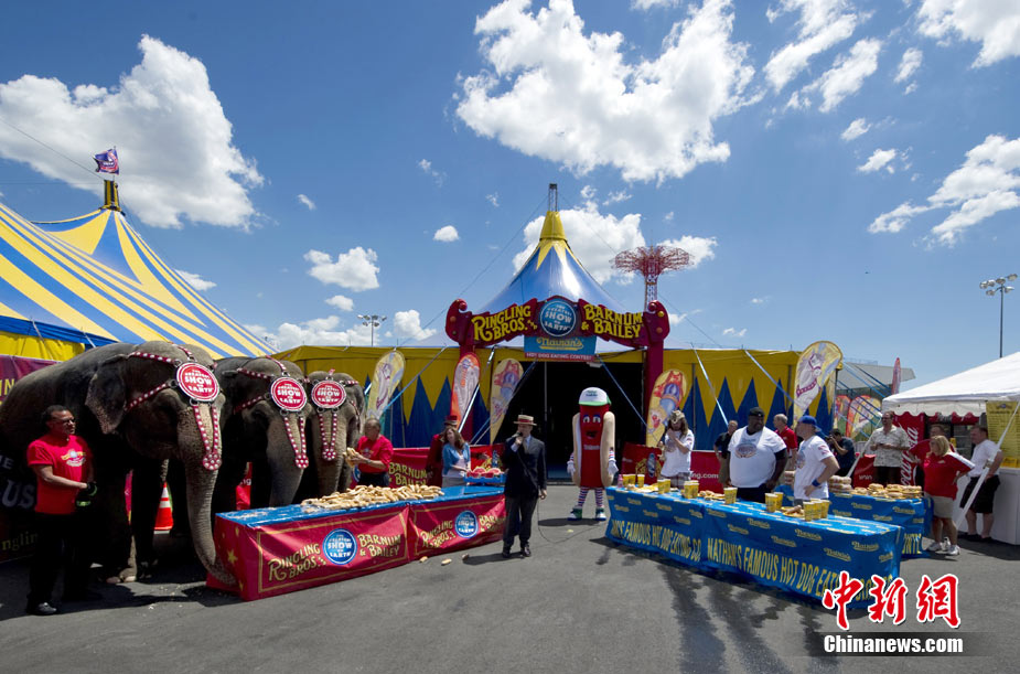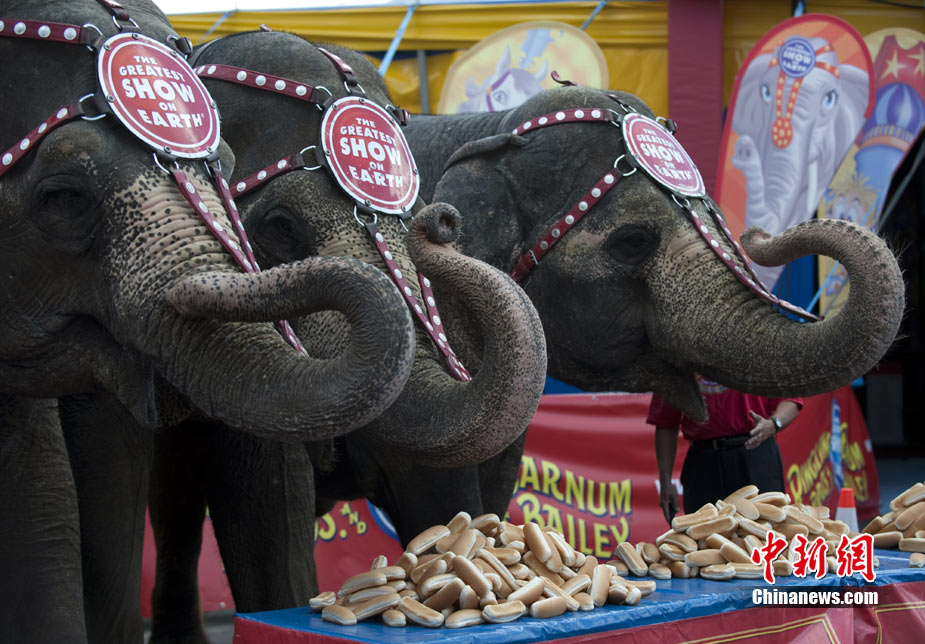 當(dāng)?shù)貢r(shí)間7月2日,在美國(guó)紐約的科尼島,一支由三只大象組成的“隊(duì)伍”和三位大胃王進(jìn)行了一次吃面包PK。最終大象隊(duì)獲得了勝利。