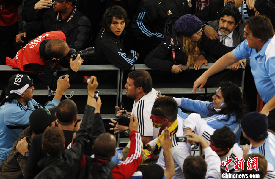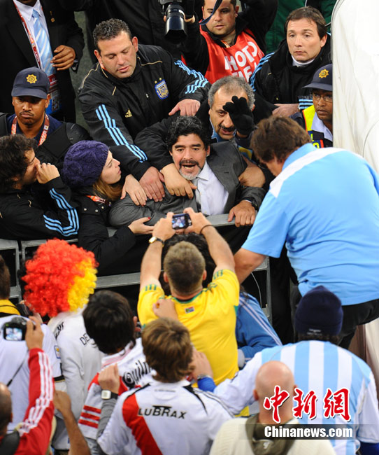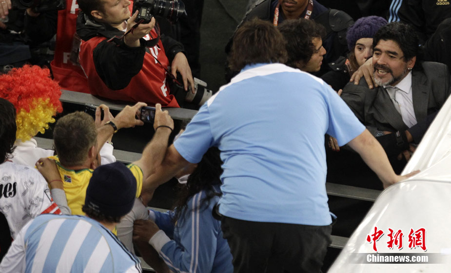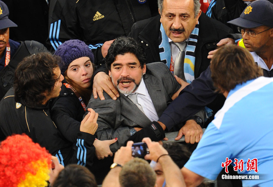 南非世界杯阿根廷與德國隊的比賽結(jié)束后,瘋狂的德國球迷對馬拉多納進(jìn)行了辱罵和奚落,急脾氣的老馬轉(zhuǎn)身沖向看臺與球迷理論,他更是要爬上看臺親手教訓(xùn)這些球迷。好在大女兒達(dá)爾瑪和阿根廷教練組成員及時前往制止,否則后果將不堪設(shè)想。