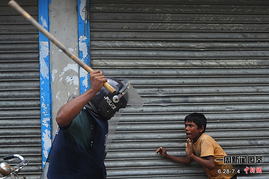 28日(周一),在印控克什米爾地區(qū)首府斯利那加市郊,當(dāng)?shù)啬滤沽衷谂e行抗議活動(dòng)時(shí)與警察發(fā)生沖突,兩名穆斯林在沖突中喪生。圖為警察在沖突中被打倒在地。