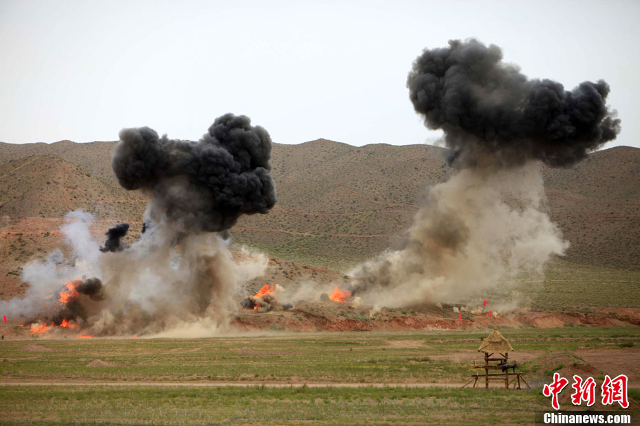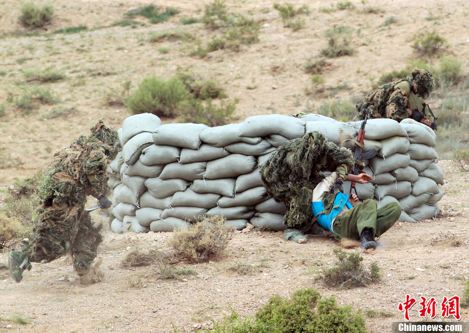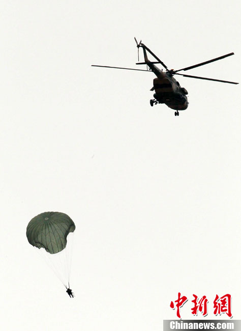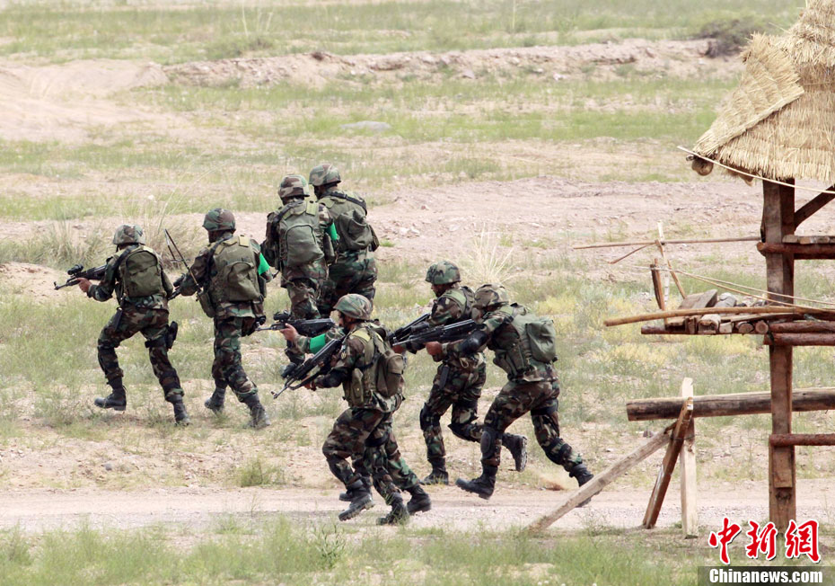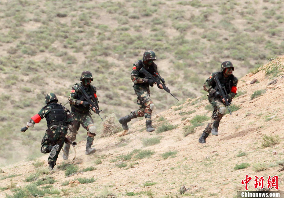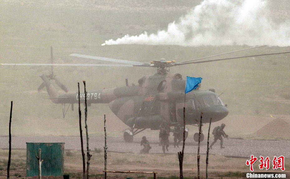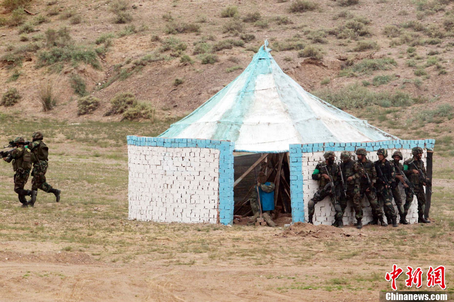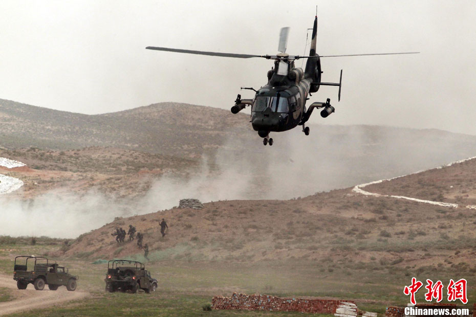 7月9日,友誼-2010”中巴反恐聯(lián)訓(xùn)在蘭州軍區(qū)某訓(xùn)練基地舉行實兵實彈演練,演練設(shè)計的背景是,對潛入中巴邊境地區(qū)實施襲擊破壞的國際恐怖分子進行聯(lián)合打擊。圍繞“邊境地區(qū)山地聯(lián)合反恐作戰(zhàn)”這一課題,演練了遠程投送、偵察監(jiān)視、立體封控、精確打擊、解救人質(zhì)、搜剿圍殲6個行動。這次反恐聯(lián)演的一個亮點,就是首次空地協(xié)同,聯(lián)合打擊,由地面反恐特戰(zhàn)人員引導(dǎo)殲轟機、武裝直升機實施空中火力突擊,采取精打要害的戰(zhàn)法,以建制內(nèi)的火器對恐怖分子營地重要目標(biāo)實施火力打擊。中新社發(fā) 杜洋 攝