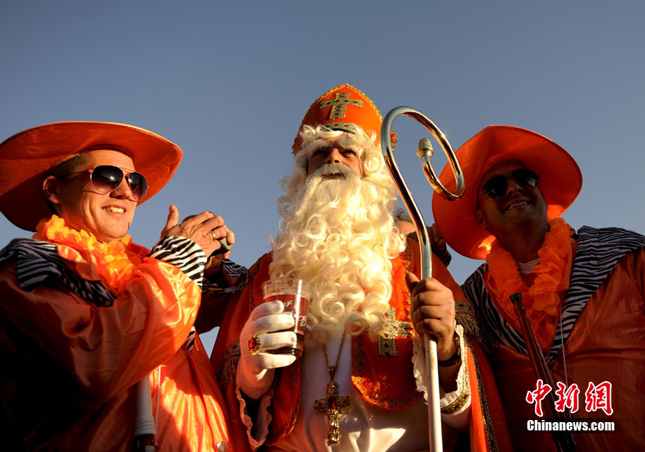 7月11日,南非約翰內(nèi)斯堡足球城,眾多荷蘭球迷在足球城球場(chǎng)外激情舞蹈。當(dāng)晚,南非世界杯荷蘭對(duì)西班牙的決賽將在足球城球場(chǎng)舉行。中新社記者 廖攀 攝