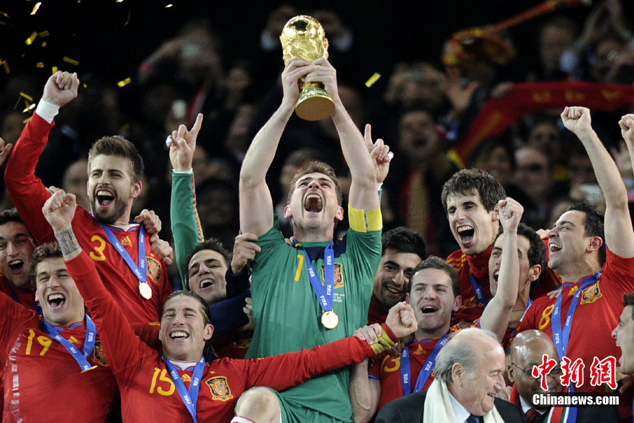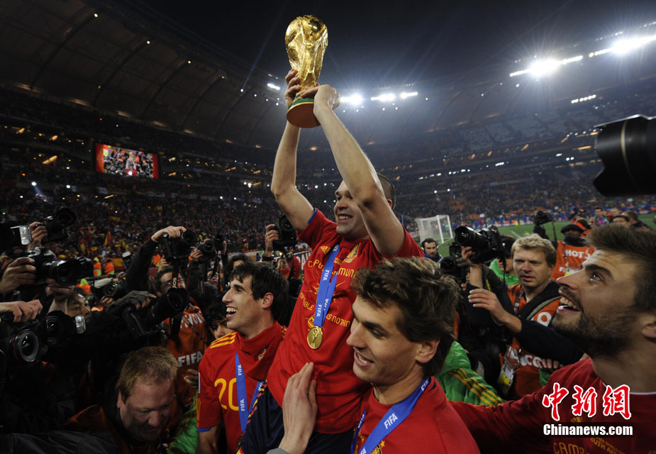 北京時間7月12日凌晨2:30,南非世界杯迎來了最終的決賽,在約翰內(nèi)斯堡的足球城球場由荷蘭隊對陣西班牙。最終雙方經(jīng)過120分鐘鏖戰(zhàn),伊涅斯塔在第116分鐘攻入全場唯一一粒進球,絕殺十人應戰(zhàn)的荷蘭隊,史上首次奪得冠軍。