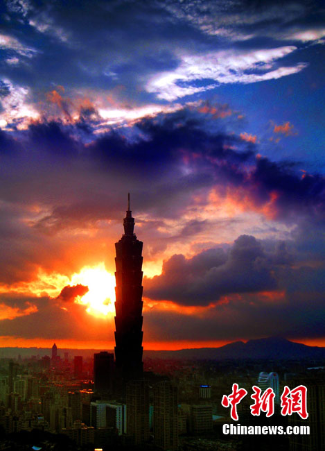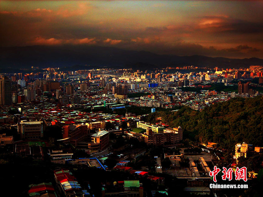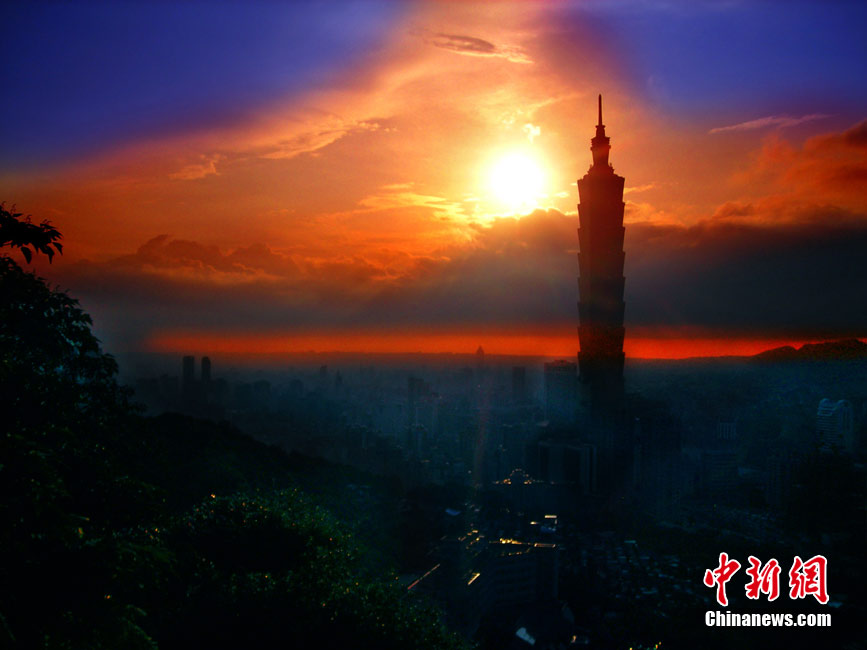 7月15日傍晚,臺北市一陣電閃雷鳴過后,太空霞光四射,從象山俯瞰市區(qū),101摩天大樓聳入云霄,景觀如畫。美麗的臺北市地處盆地,氣候多變,夏季的城市景色也時常變幻莫測。中新社記者 宋吉河 攝