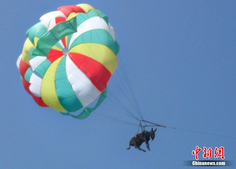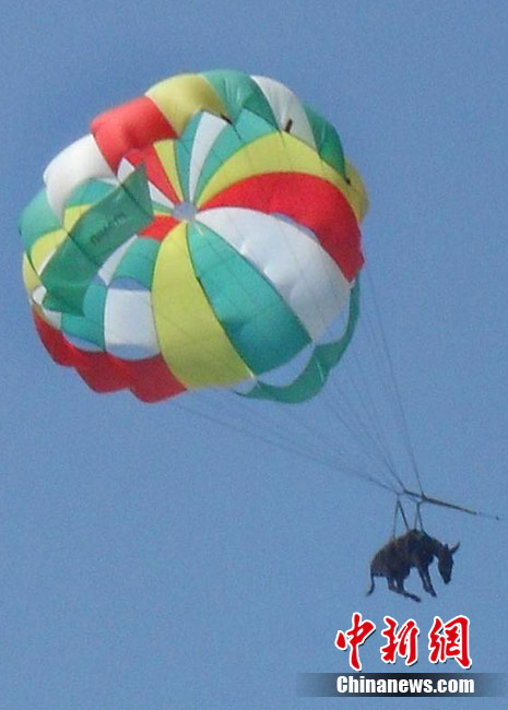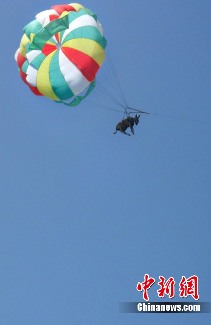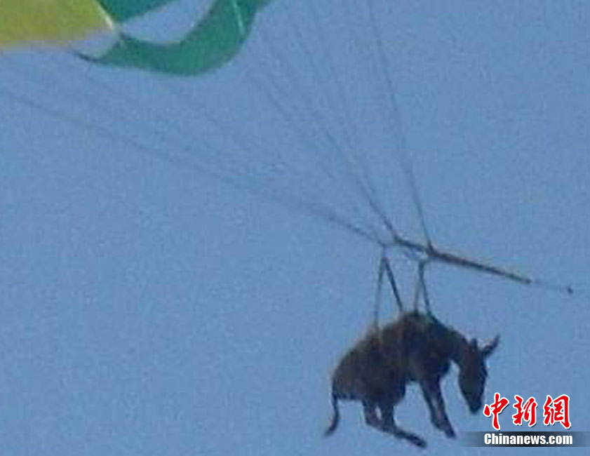 俄羅斯警方于20日表示,上周在俄羅斯東部亞速海岸,游客及當(dāng)?shù)孛癖姀恼克{(lán)的天空中看到了驚人的一幕:一頭身上綁著降落傘的毛驢正在天上繞著圈圈!(jù)稱,當(dāng)時(shí)這頭毛驢因?yàn)轶@恐,而破嗓大叫。