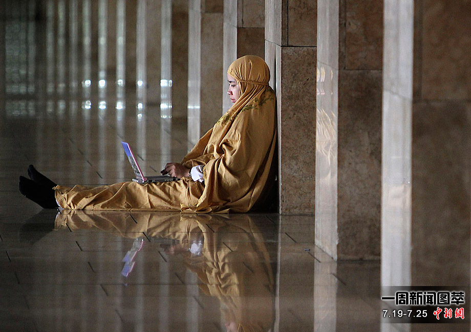 周一(19日),一名印尼穆斯林婦女在雅加達(dá)Istiglal清真寺做完午后禱告后用她的筆記本電腦工作。