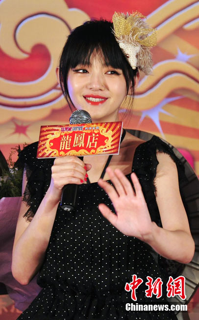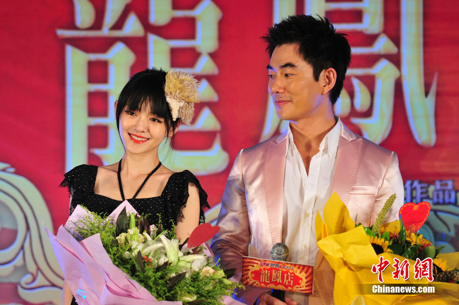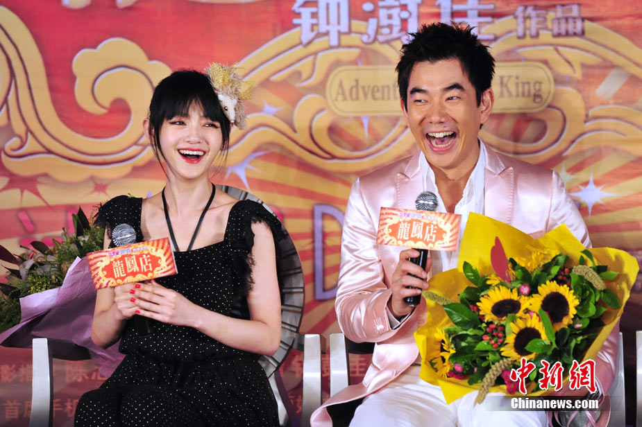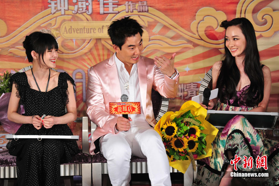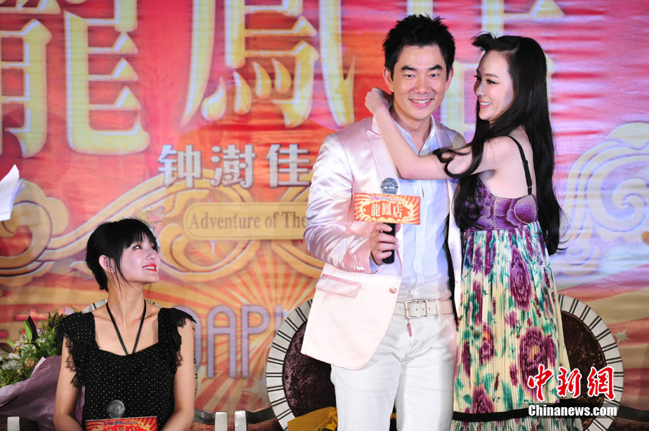 7月30日,古裝愛情喜劇《龍鳳店》在京舉辦官網(wǎng)啟動暨終極海報揭幕發(fā)布會,導(dǎo)演鐘澍佳攜主演任賢齊、大S、霍思燕亮相,臺灣著名音樂人小蟲前來助陣。大S頭戴“刺猬”發(fā)卡可愛亮相,與任賢齊在現(xiàn)場大談對唱《龍鳳店》主題曲的感受,大S笑稱唱歌比小S好聽。后來登臺的霍思燕卻大搶大S風(fēng)頭,她為任賢齊親手戴上禮物項鏈,還親密擁抱久久對視,兩人在現(xiàn)場大秀親昵立刻成為眾人矚目焦點(diǎn),讓大S在一旁有點(diǎn)沒事做。中新社記者 李學(xué)仕攝