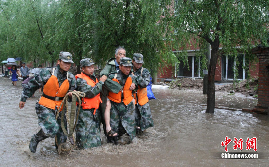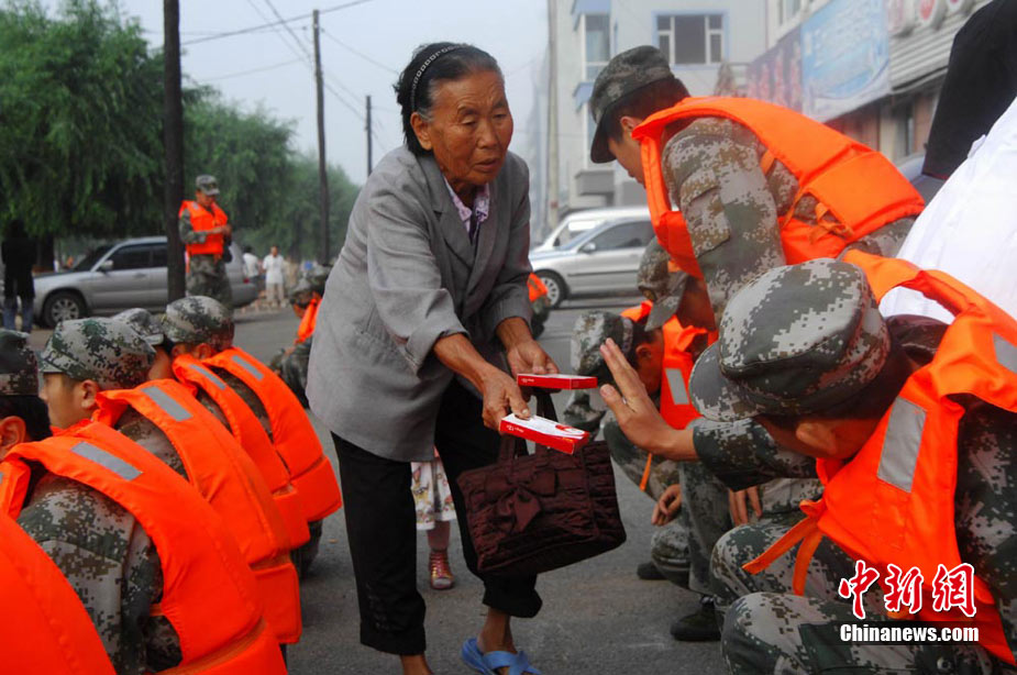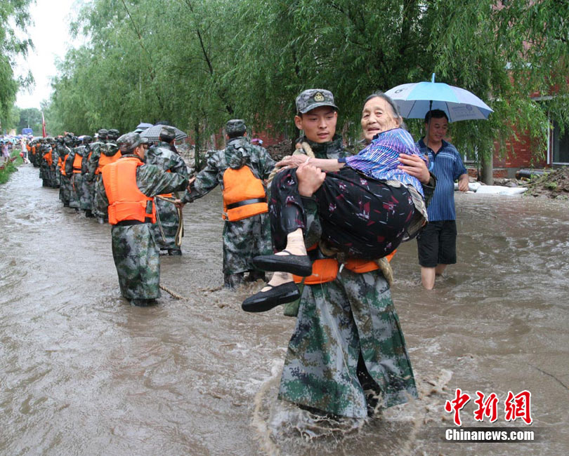 28日以來的一場暴雨讓吉林省多個地區(qū)遭遇罕見洪災,此后對災區(qū)的救援緊張進行。目前在永吉縣口前鎮(zhèn),已有部分商戶恢復營業(yè)。圖為在重災區(qū)永吉縣,士兵將一名老婦轉移到安全地帶。中新社記者 張杰 攝