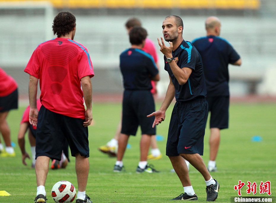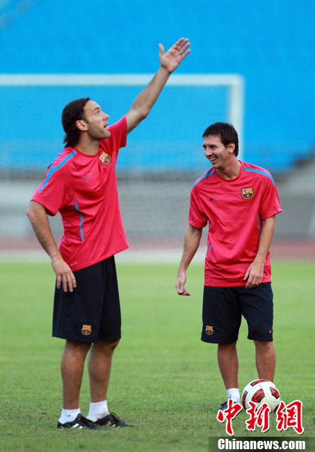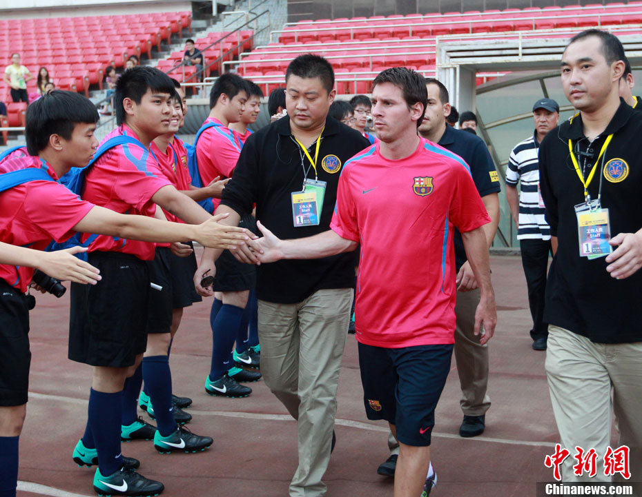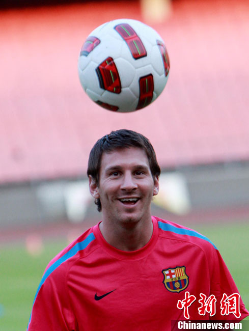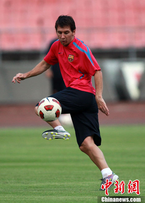 8月6日,巴塞羅那俱樂部在北京工人體育館進(jìn)行了第二次公開訓(xùn)練課,眾多巴薩球迷也在現(xiàn)場目睹了球隊風(fēng)采。圖為梅西出場表情輕松。中新社發(fā) 杜洋 攝