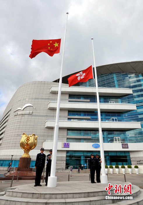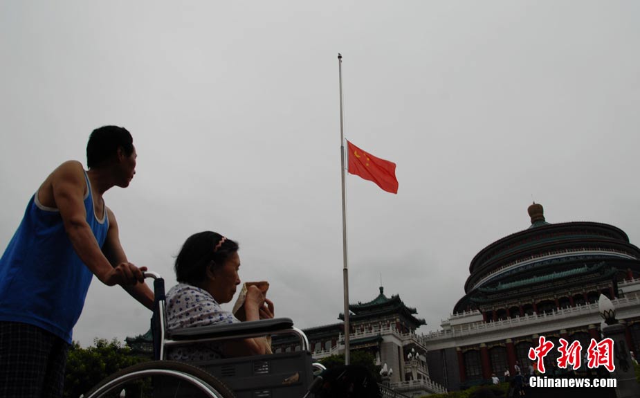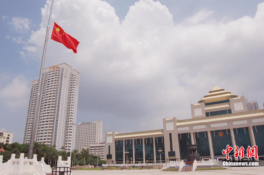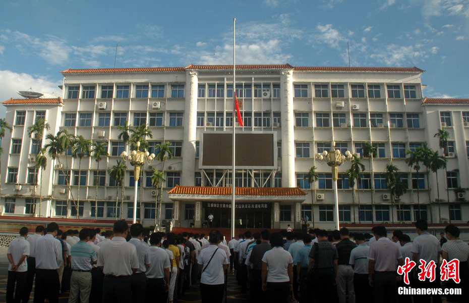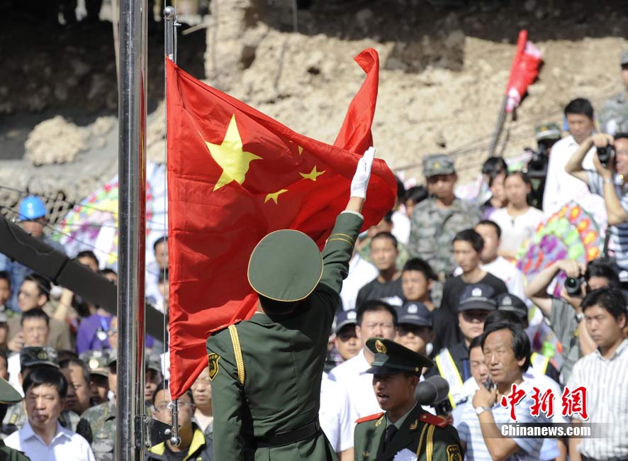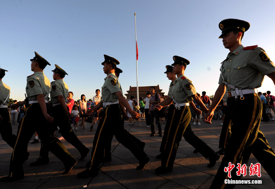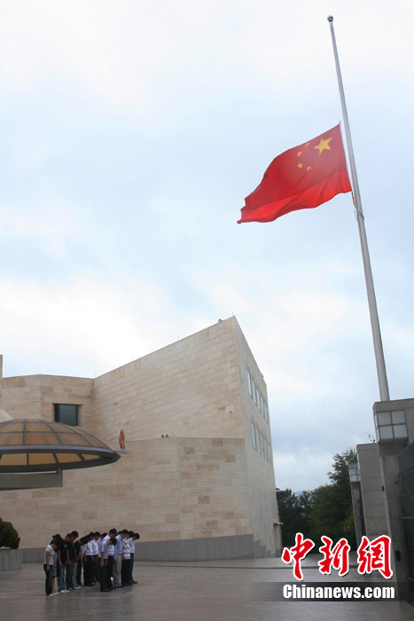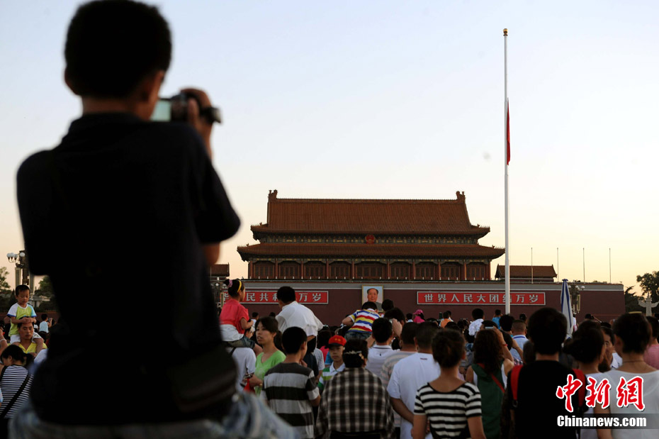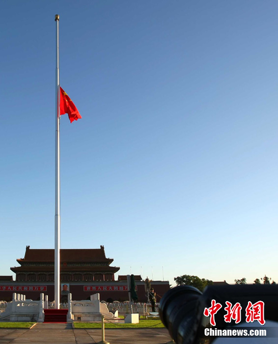 8月15日5時(shí)28分,天安門廣場(chǎng)下半旗,對(duì)甘肅舟曲特大山洪泥石流遇難同胞表示深切哀悼。這是繼2008年5月汶川地震和今年4月玉樹地震后,國(guó)旗第三度為普通國(guó)民而降。中新社記者 富田 攝