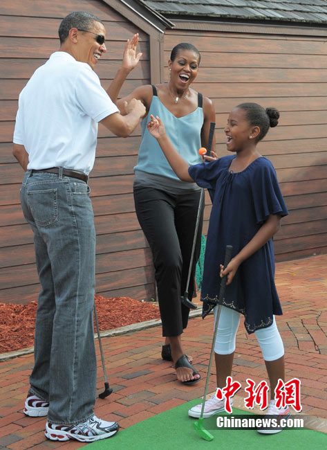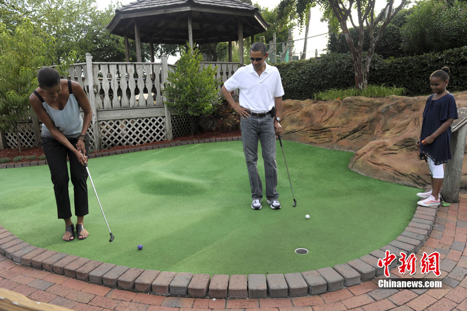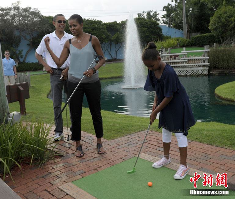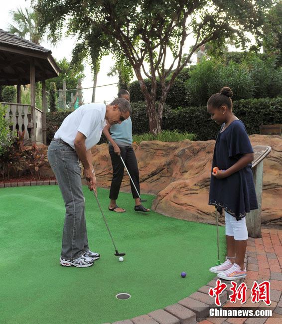 近日,奧巴馬到佛羅里達(dá)巡視墨西哥灣油污清理作業(yè)、推銷(xiāo)當(dāng)?shù)赜^光的機(jī)會(huì)。14日,他帶著妻女到佛羅里達(dá)一個(gè)迷你高爾夫球場(chǎng)散心, 全家一起上陣,小試身手。