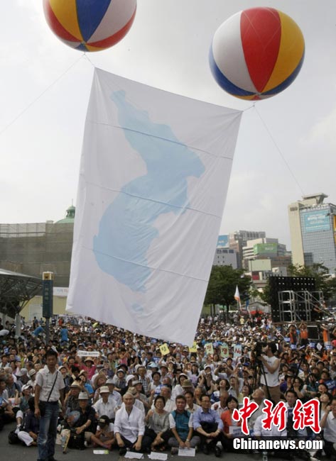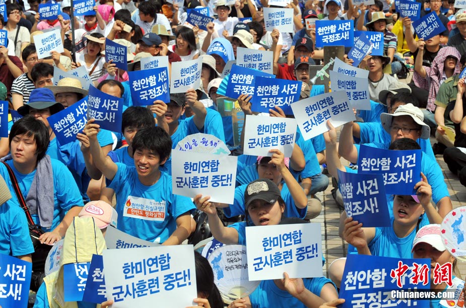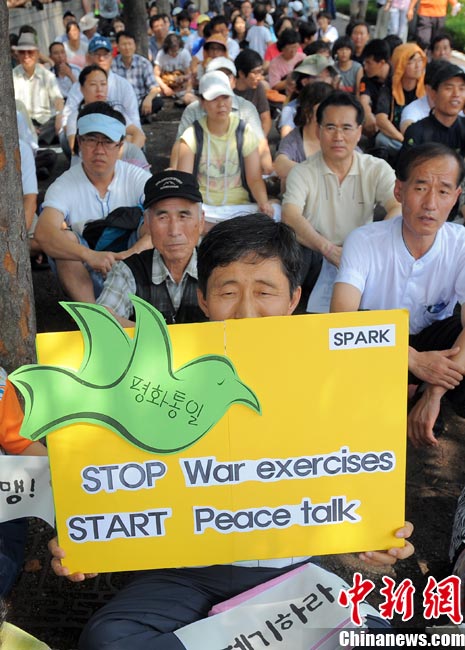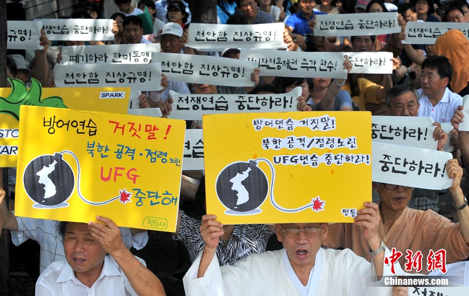 8月15日,在韓國首都首爾,韓國民眾在戰(zhàn)爭紀(jì)念館前集會,反對韓國與美國舉行代號為“乙支自由衛(wèi)士”的聯(lián)合軍演。