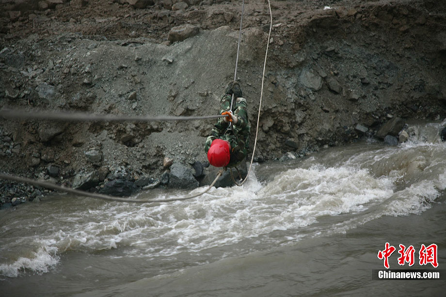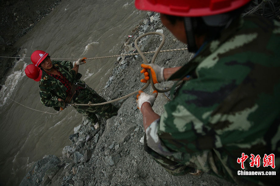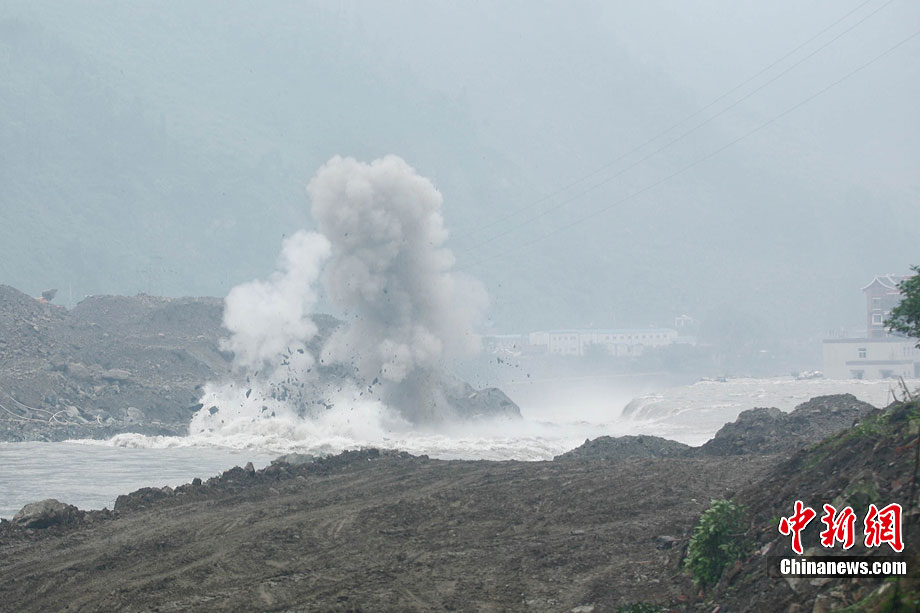 8月17日下午,映秀泥石流搶險(xiǎn)救災(zāi)指揮部對致使岷江改道的堰塞體進(jìn)行了第二次爆破,由于天氣不甚理想,為了盡快實(shí)現(xiàn)岷江河水“回軌”,救援指揮部決定以爆破的方式加快搶險(xiǎn)進(jìn)度。據(jù)爆破現(xiàn)場負(fù)責(zé)人透露,此次爆破主要是為解決8塊巨石,這些巨石超出了挖掘機(jī)的負(fù)荷量,必須選擇爆破方式解決。中新社發(fā) 張浪 攝