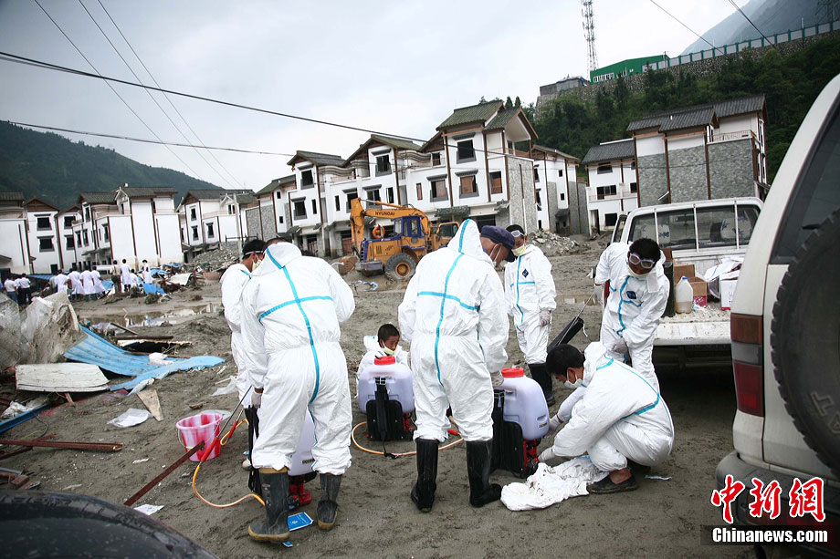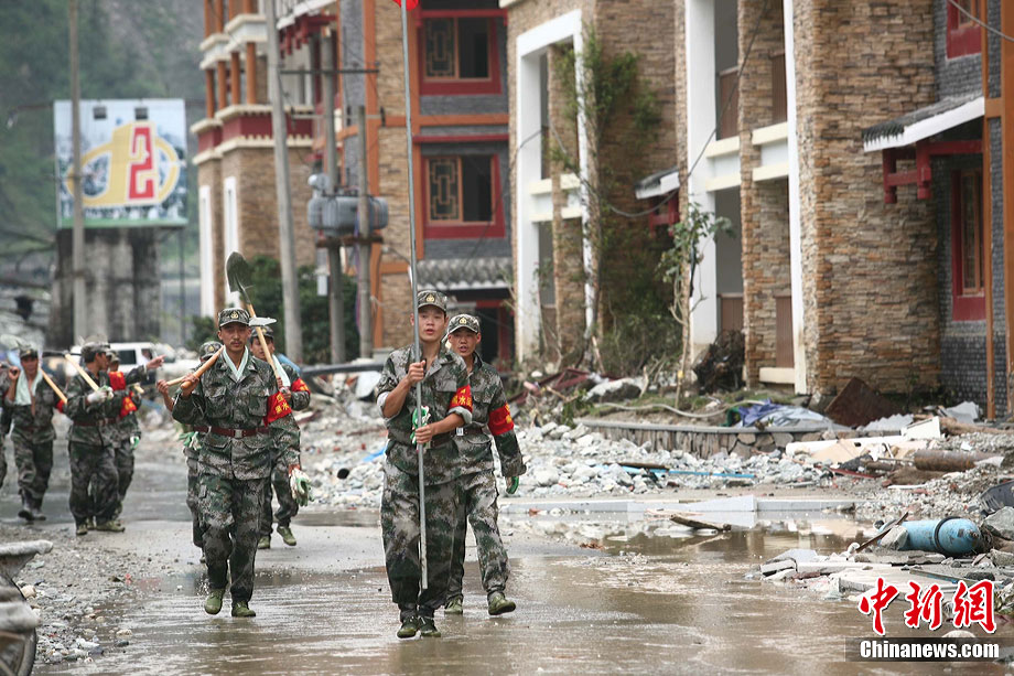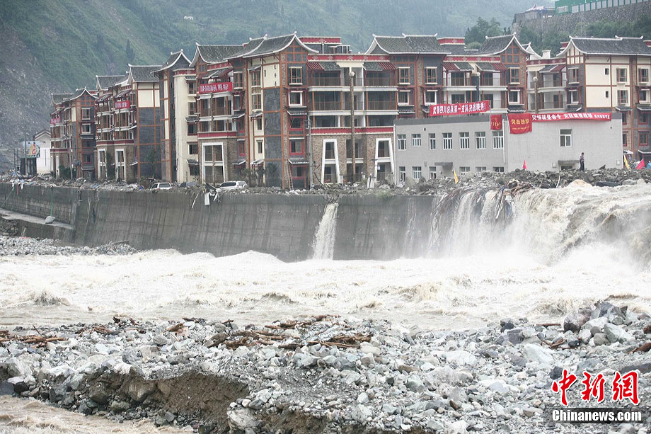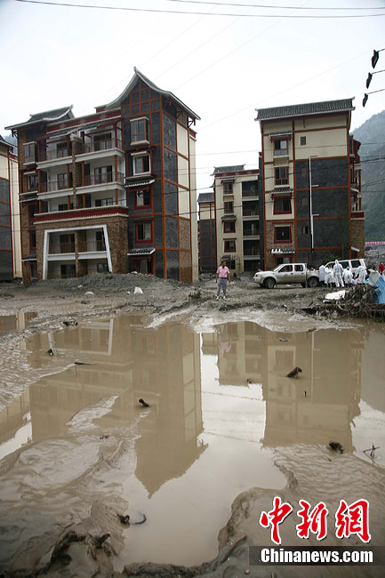 8月18日,經(jīng)過搶險(xiǎn)隊(duì)連夜奮戰(zhàn),汶川泥石流重災(zāi)區(qū)映秀鎮(zhèn)新城水位終于退去,防疫人員、清淤隊(duì)伍陸續(xù)進(jìn)入新城展開清潔工作,武警水電三總隊(duì)于當(dāng)日對堰塞體進(jìn)行第三次爆破。圖為退水后的映秀鎮(zhèn)新城。中新社發(fā) 張浪 攝
