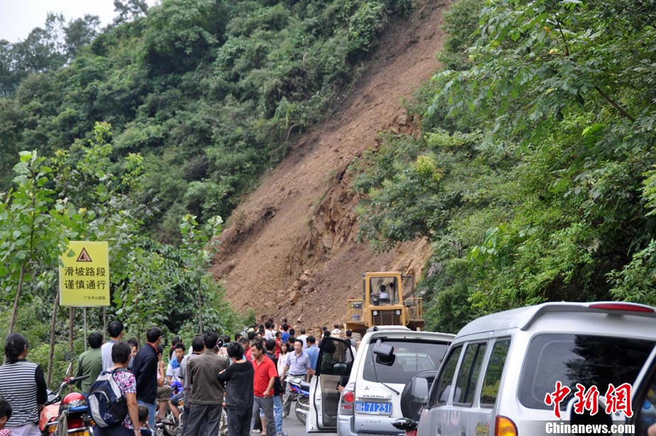 8月18日16時(shí),四川省青川縣城前往蒿溪鄉(xiāng)的道路由于暴雨造成塌方,導(dǎo)致道路中斷,車輛通行受阻,F(xiàn)場(chǎng)由于再次出現(xiàn)大量山體垮塌,部分路段搶險(xiǎn)工作被迫停止。中新社發(fā) 劉忠俊 攝