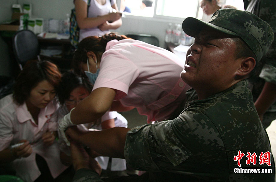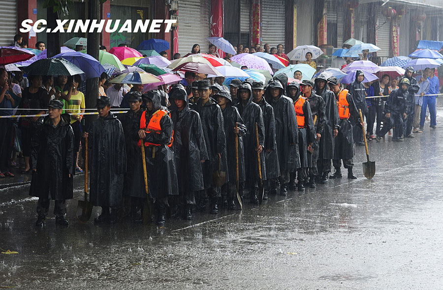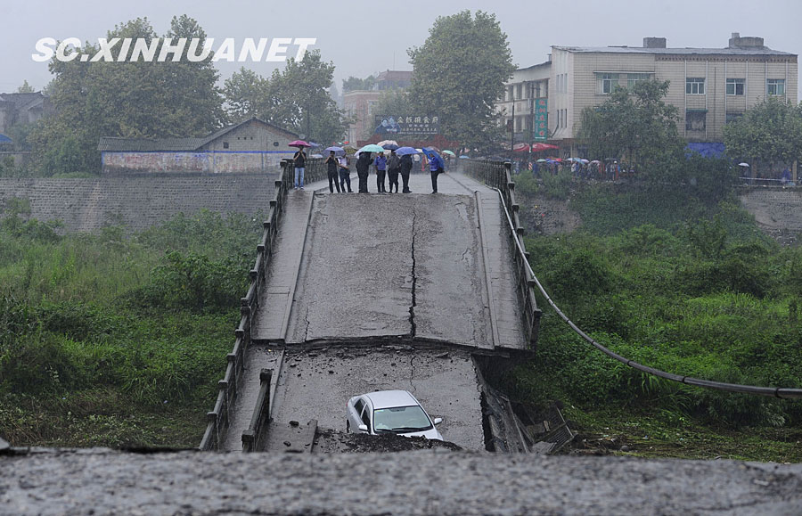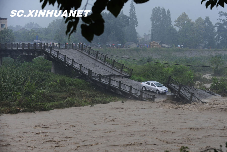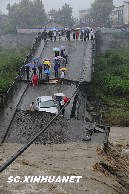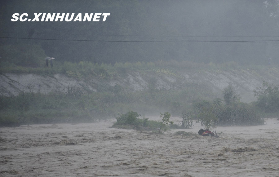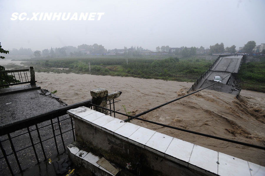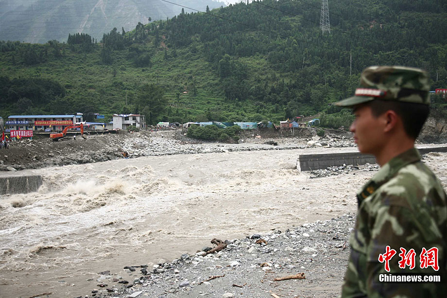 8月19日晚10時(shí)許,洪峰再次通過汶川縣映秀鎮(zhèn),突如其來的洪峰沖垮了映秀鎮(zhèn)堰塞體旁的防護(hù)欄,造成該段岷江水位下降,湍急的水流轉(zhuǎn)向沖刷映秀鎮(zhèn)新城河堤,搶險(xiǎn)隊(duì)已用裝有石料的鐵絲網(wǎng)圍住河堤以保護(hù)映秀鎮(zhèn)新城。圖為已沖毀的岷江防護(hù)欄。中新社發(fā) 張浪 攝