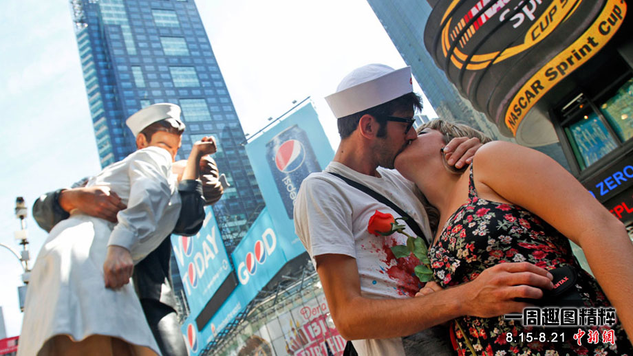來(lái)自不同國(guó)家、不同種族的200多對(duì)情侶,14日齊聚紐約時(shí)報(bào)廣場(chǎng),再現(xiàn)“勝利日之吻”的經(jīng)典瞬間,以此紀(jì)念二戰(zhàn)結(jié)束65周年。