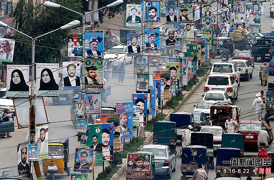 周一(16日),阿富汗城市賈拉拉巴德的街道上布滿議員競(jìng)選的海報(bào)。阿富汗將于9月份舉行議會(huì)選舉。