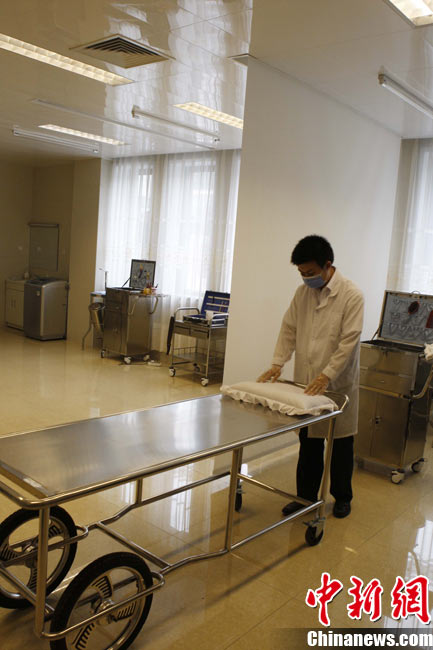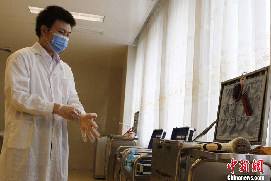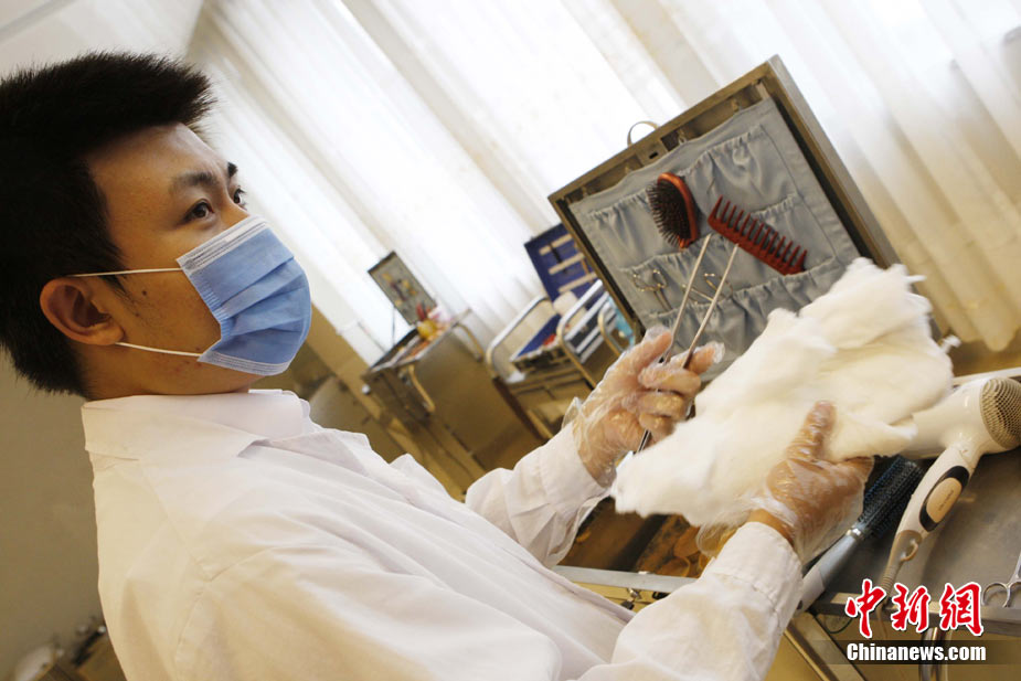 近期,北京團(tuán)市委正在開展“探訪青年勞動(dòng)者”活動(dòng)。二十八歲的八寶山殯儀館整容師張洋便是其中之一。他自二〇〇五年進(jìn)入八寶山殯儀館工作以來(lái),勤學(xué)苦練,刻苦鉆研,勇于創(chuàng)新,共為三千余位逝者提供了高質(zhì)量的整容服務(wù),圓滿完成了二零一零年八名駐海地維和人員不幸遇難后遺體整容工作等二十余次重大任務(wù)。在剛剛結(jié)束的全國(guó)民政行業(yè)職業(yè)技能競(jìng)賽中奪得大賽一等獎(jiǎng)第一名。中新社記者 任海霞 攝