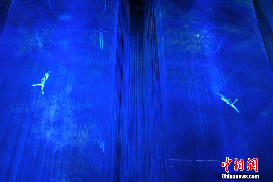 8月23日,北京武搏會開幕式彩排中,演員在由12.5萬根筷子粗細的腈綸線組成的“線陣”中表演。據(jù)了解,這是國內(nèi)首次使用“線陣”作為開幕式創(chuàng)意。 中新社發(fā) 蘇丹 攝