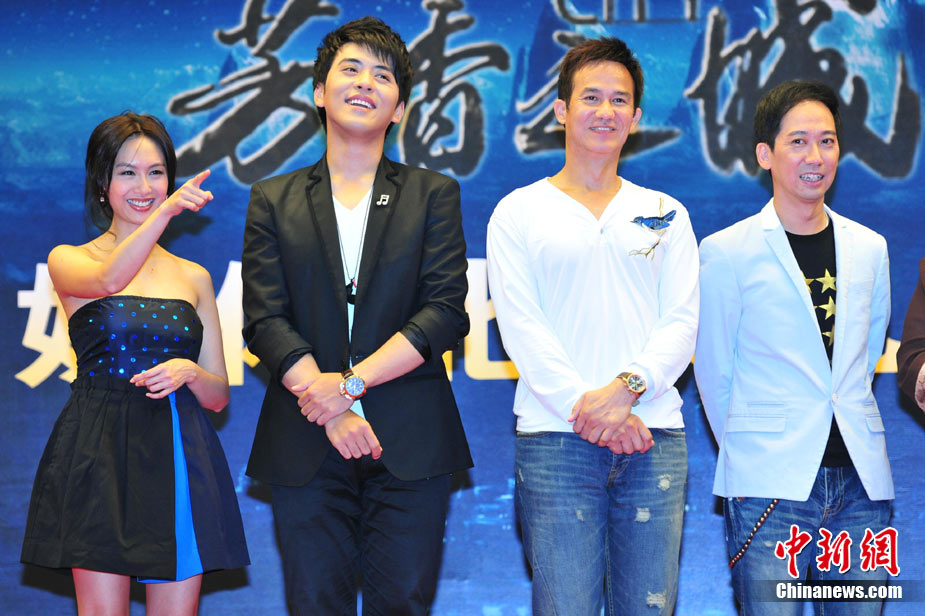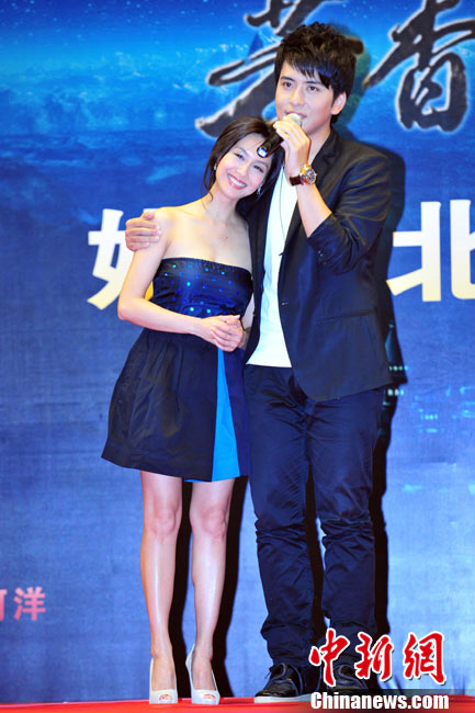 8月25日,電影《芳香之城傳奇》在北京舉行記者會。不老的“紫霞仙子”朱茵攜主演扎西頓珠、張達明、李子雄、張璇、董立范等亮相。朱茵以一襲抹胸短裙亮相,自曝在新片中大轉(zhuǎn)型,飾演一個有天然體香的神秘啞女,男主角扎西頓珠飾演的“富二代”被其吸引后,上演了一段純美姐弟戀。朱茵在接受采訪時坦言自己并不拒絕姐弟戀。圖為朱茵、扎西頓珠現(xiàn)場秀親昵。中新社記者 李學仕 攝