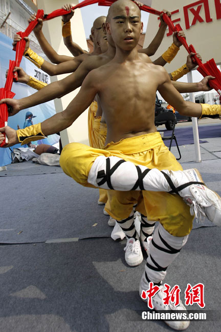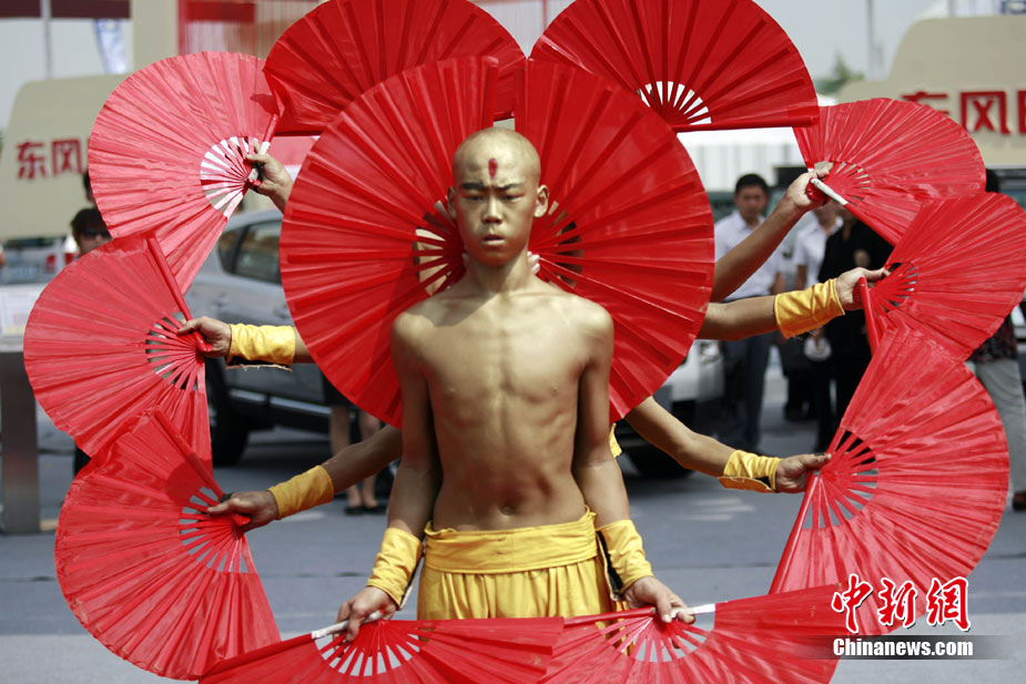 8月27日,河南鄭州一車(chē)展上,一群“和尚”模樣的功夫小子們舞出羅漢功夫扇客串車(chē)模來(lái)吸引參觀者的眼球。據(jù)該參展企業(yè)介紹,這種別出心裁的做法往往能令參觀者耳目一新,更能吸引消費(fèi)者眼球。中新社記者 王中舉 攝