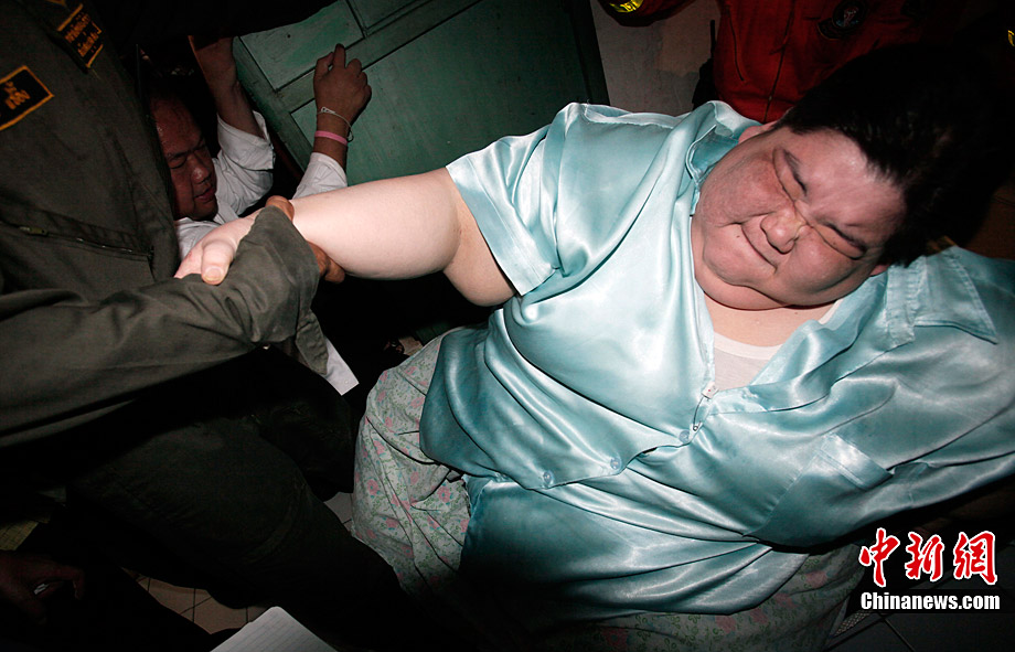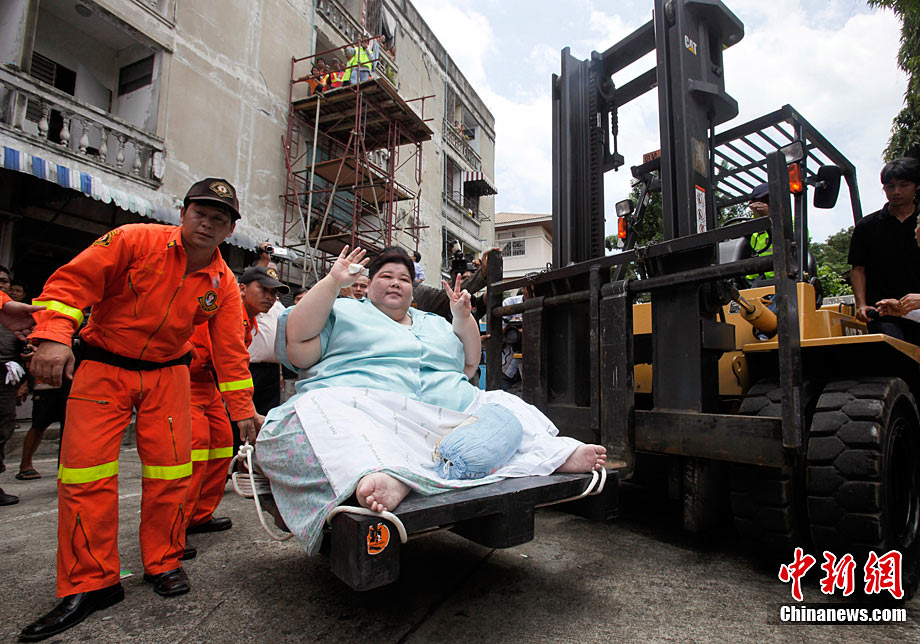 泰國最胖的女子烏努埃蓬(Umnuayporn Tongprapai)于當?shù)貢r間8月26日在政府派遣的由工程師、拆卸專家、救援隊、醫(yī)生和護士組成的救援團隊幫助下“走”出三年未曾離開的住所。44歲的烏努埃蓬住在泰國首都曼谷的郊區(qū),她的體重高達274公斤,被認為是泰國最胖的人。