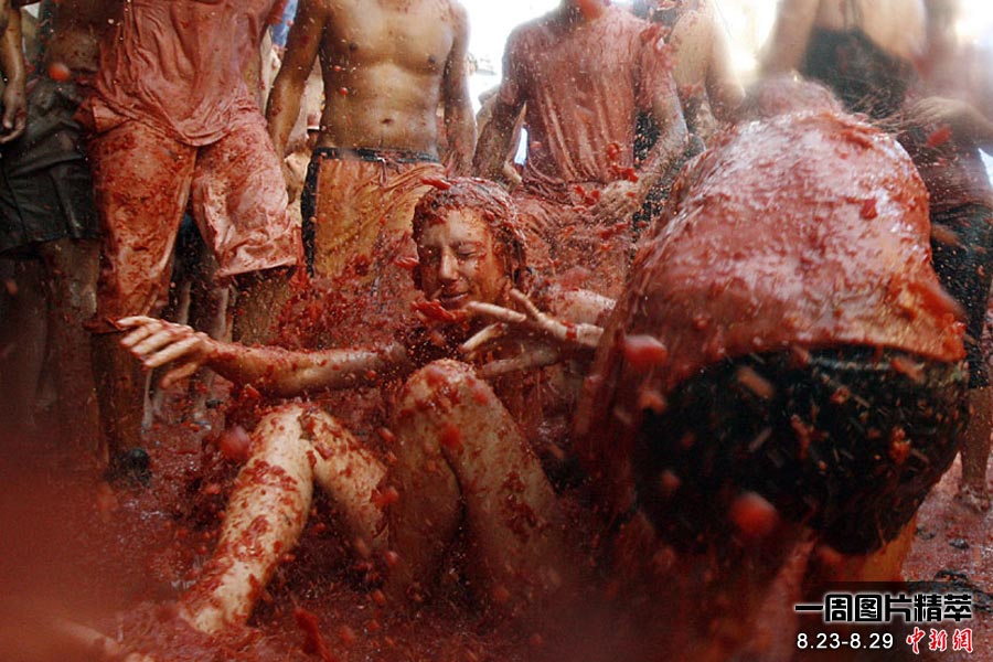 西班牙布尼奧爾小鎮(zhèn)舉行一年一度的西紅柿節(jié),成千上萬(wàn)來(lái)自世界各地的人們慕名前往。圖為一名男子躺在西紅柿果漿中。