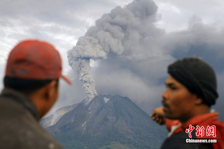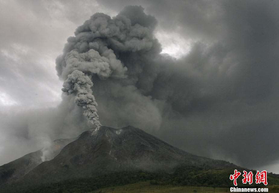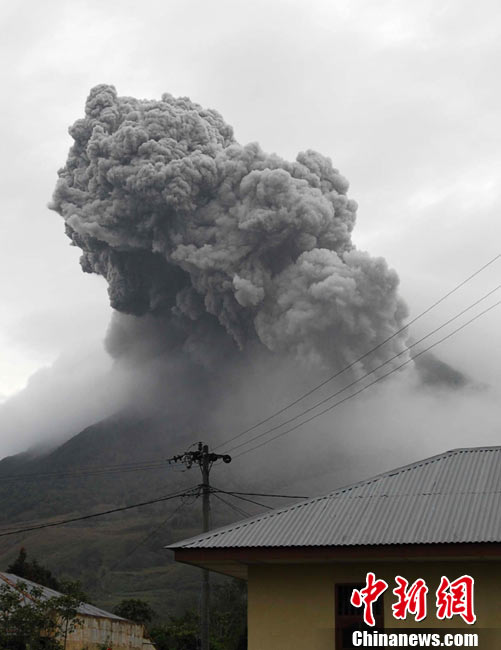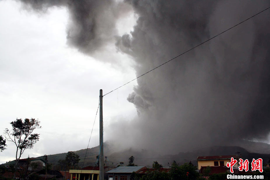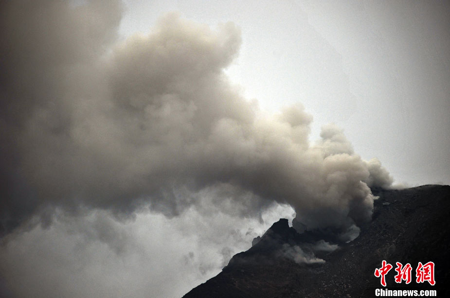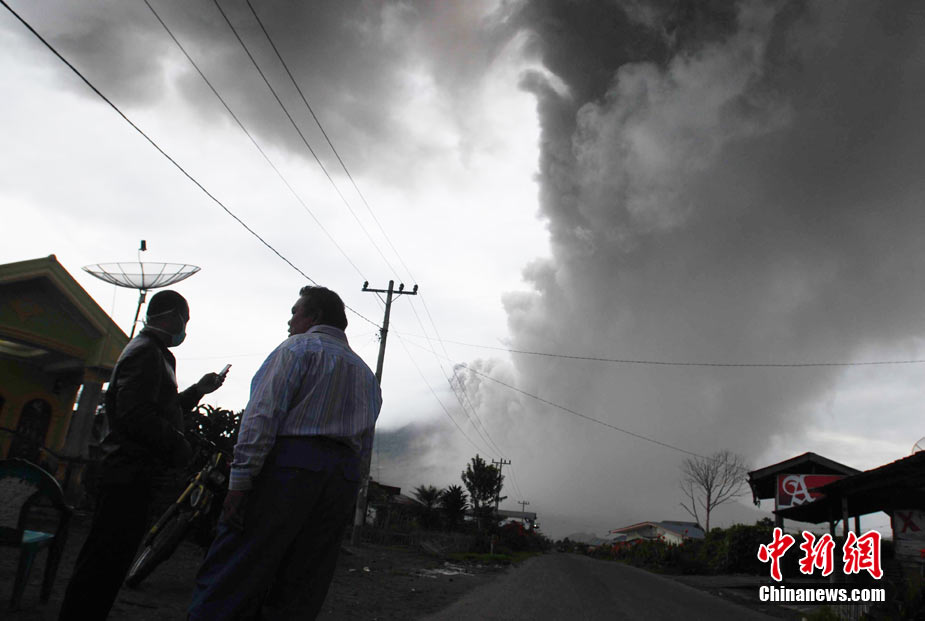 印尼錫納朋火山30日再次噴發(fā)并持續(xù)了將近15分鐘;鹕絿姵龅臐鉄熀突鹕交抑辽偕2000米的高空。這比29日錫納朋火山的首次噴發(fā)的規(guī)模更大。空氣中彌漫著濃濃的硫磺味。