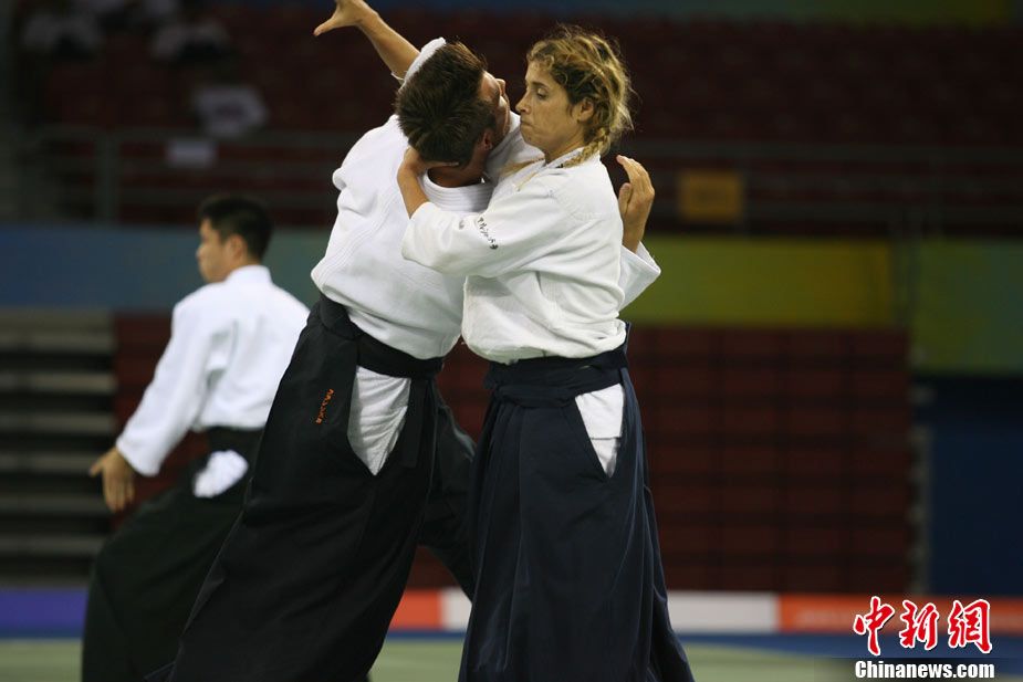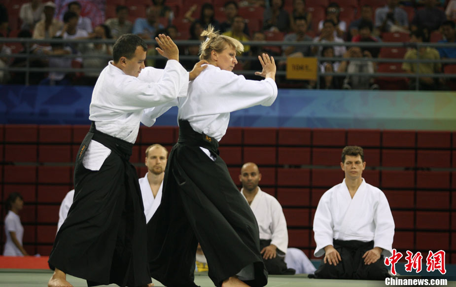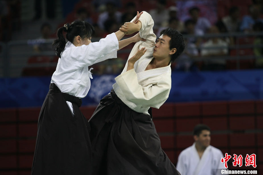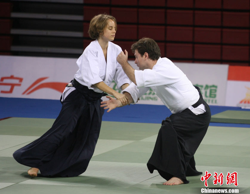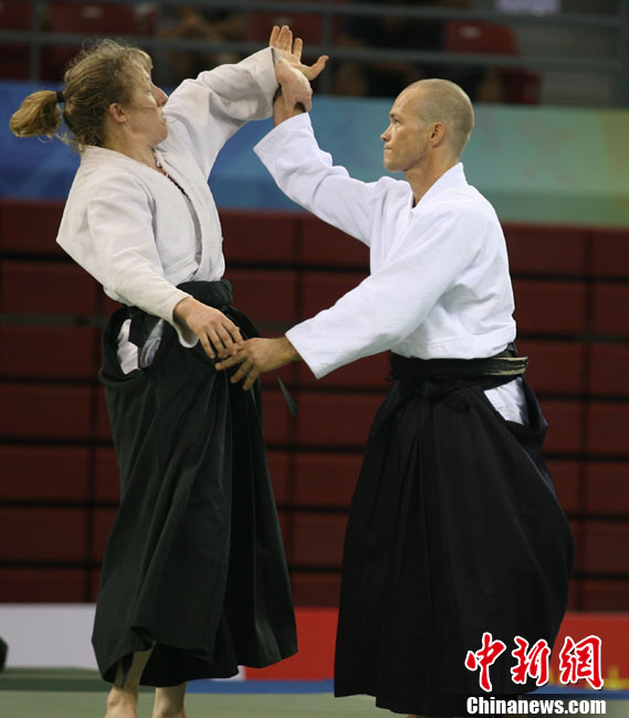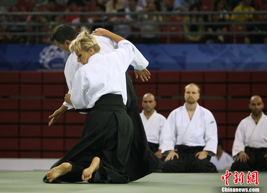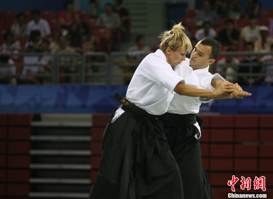 8月30日,男女選手在北京武搏會合氣道比賽上演了“異性對決”。合氣道是一種根源于日本大東流合氣柔術的近代武術,合氣道不注重比賽的勝負,沒有跟別人較量的思想,而是跟他人一起鍛煉和修養(yǎng)自己,因此才會有鮮見的異性同場對決的場面出現。本次武搏會,合氣道將作為表演項目,無特別的規(guī)則,因此不能夠嚴格地定義勝利者或者失敗者。國際合氣道聯合會將組織高段教官來評判各項表演,表演賽分為基本技巧、高級技巧和復合技巧等三個單元。 中新社發(fā) 蘇丹 攝
