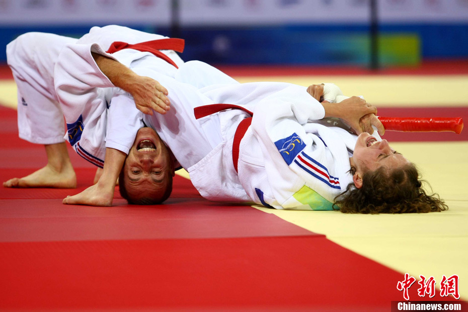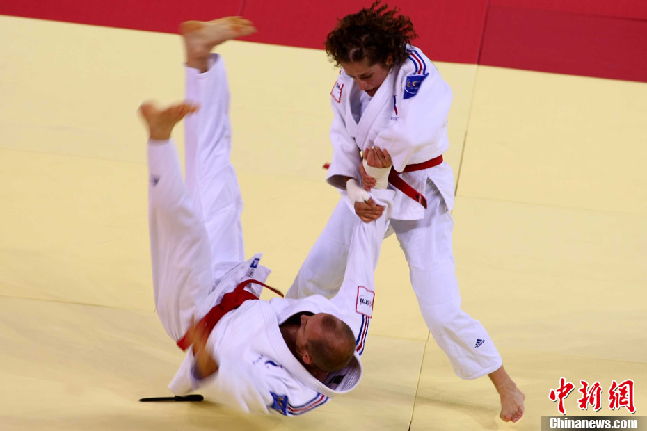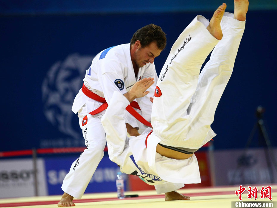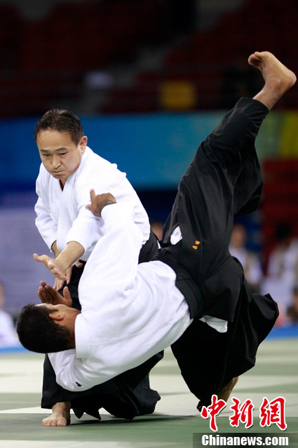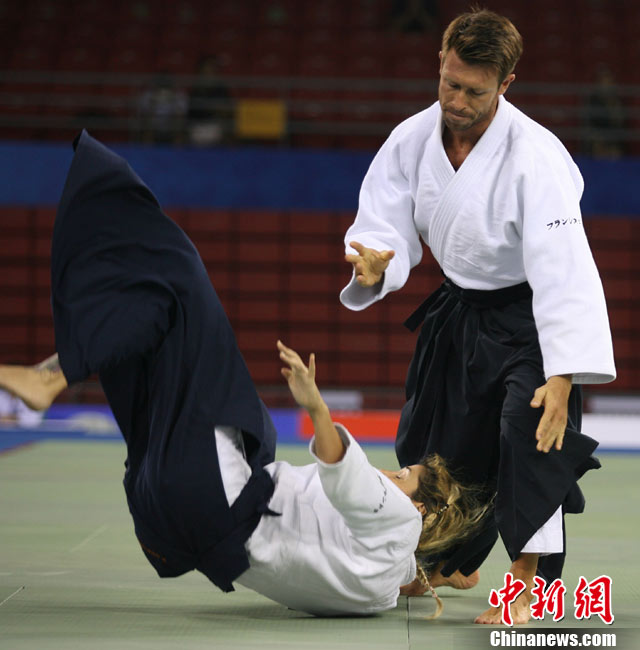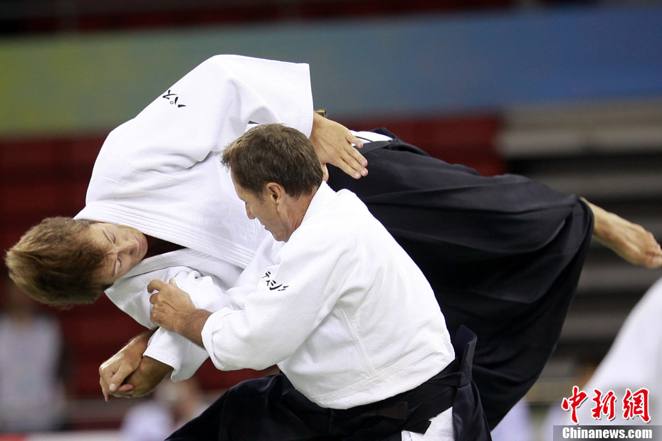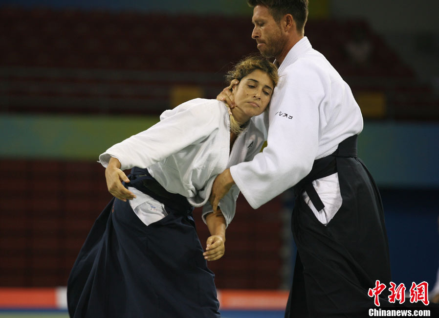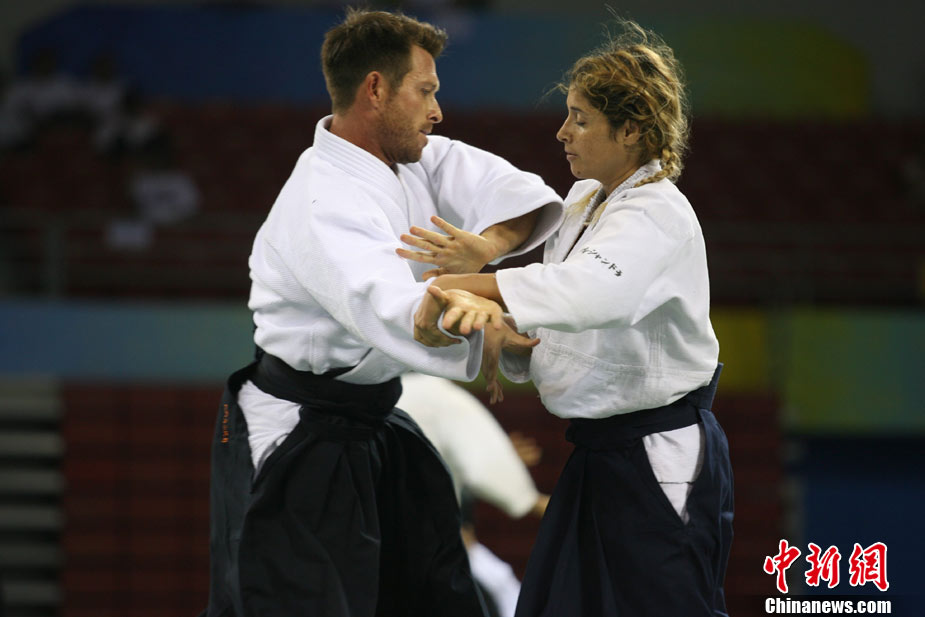 8月30日,男女選手在北京武搏會合氣道比賽上演了“異性對決”。合氣道是一種根源于日本大東流合氣柔術的近代武術,合氣道不注重比賽的勝負,沒有跟別人較量的思想,而是跟他人一起鍛煉和修養(yǎng)自己,因此才會有鮮見的異性同場對決的場面出現。本次武搏會,合氣道將作為表演項目,無特別的規(guī)則,因此不能夠嚴格地定義勝利者或者失敗者。國際合氣道聯合會將組織高段教官來評判各項表演,表演賽分為基本技巧、高級技巧和復合技巧等三個單元。 中新社發(fā) 蘇丹 攝