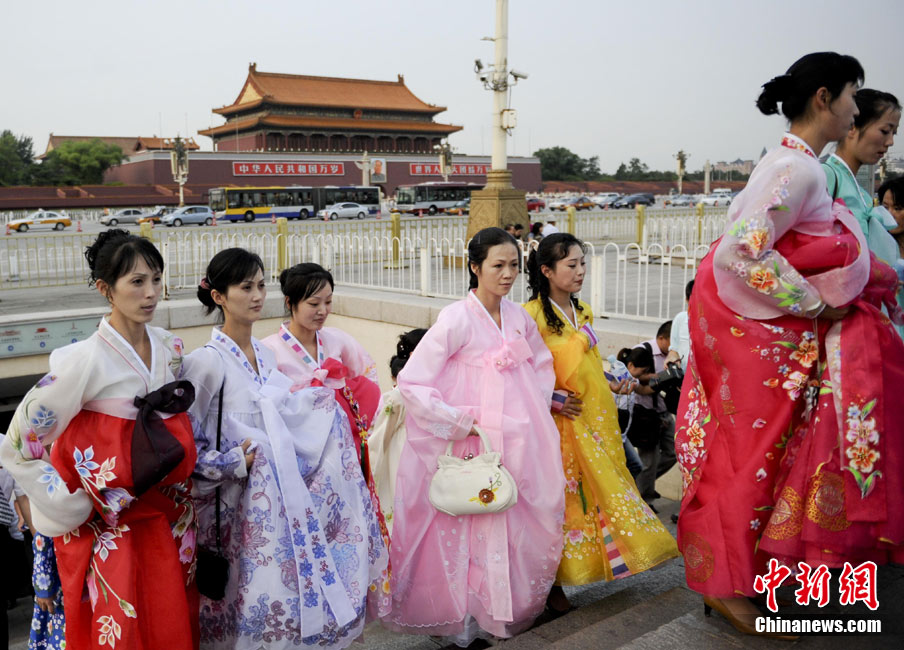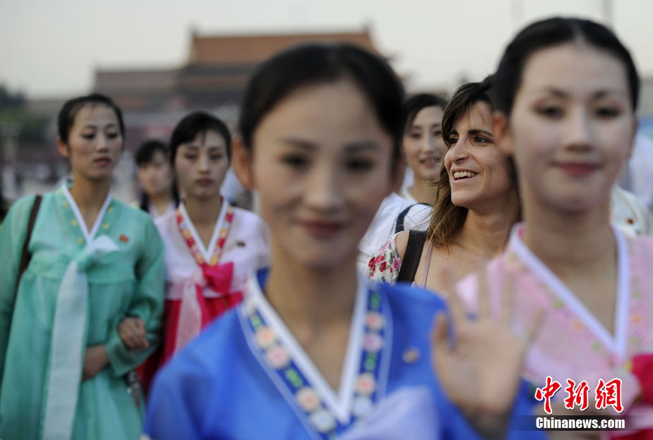 9月1日,朝鮮平壤藝術(shù)團(tuán)的藝術(shù)家參觀天安門廣場(chǎng)。當(dāng)日,朝鮮平壤藝術(shù)團(tuán)在中國(guó)全國(guó)的巡演活動(dòng)正式啟動(dòng),平壤藝術(shù)團(tuán)將在上海世博、寧波、廣州、深圳、珠海、昆明、重慶、武漢等20多個(gè)城市巡演“怒放的金達(dá)萊”。中新社記者 廖攀 攝