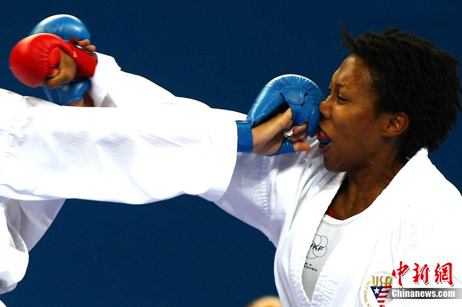 9月1日,2010年北京首屆世界武搏運動會空手道項目在北京科技大學(xué)體育館結(jié)束了全部爭奪。圖為在女子-68公斤級決賽中,來自美國的墨菲(Murphy)(圖)被法國選手泛亞特(Fanjat)擊中面部,最終不敵對手屈居第二。中新社記者 富田 攝