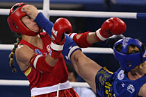 9月3日,2010年北京首屆世界武搏會自由搏擊項目在北京奧體中心體育館開賽,設有半接觸搏擊、全接觸搏擊和低踢三項,其中半接觸設有男子63、69、74、79、84公斤級五個級別和女子55、60公斤級兩個級別,全接觸及低踢級別設置相同,有男子63、67、71、75、81公斤級五個級別和女子56、60公斤級兩級別。每場比賽三回合、每回合兩分鐘。中國六選手(2女4男)參賽。圖為男子全接觸75公斤級四分之一決賽,巴西選手Rafael Kaiser(左)進攻。中新社記者 盛佳鵬 攝