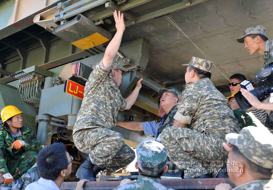 顧不上長途奔波和路途勞累的參演官兵,到達換裝點后就立即開始了換乘換裝。經(jīng)過近6小時的卸載、裝載,中方參演部隊的裝備車輛全部駛上了哈方軍列,并在鐵路專業(yè)裝卸隊的協(xié)助下,對20噸以上輪式裝備按照哈方的要求進行捆綁加固。
