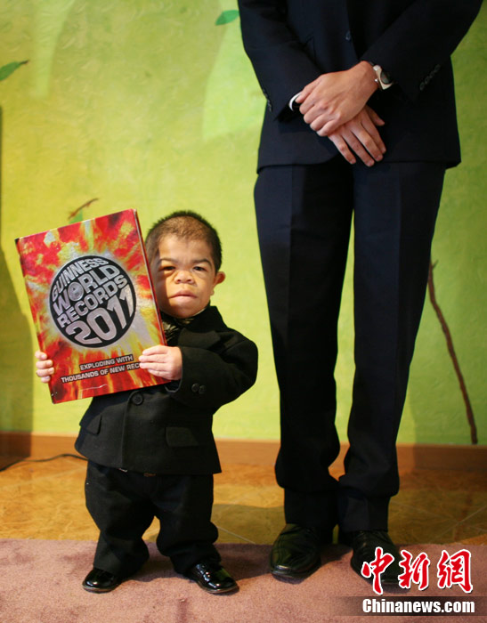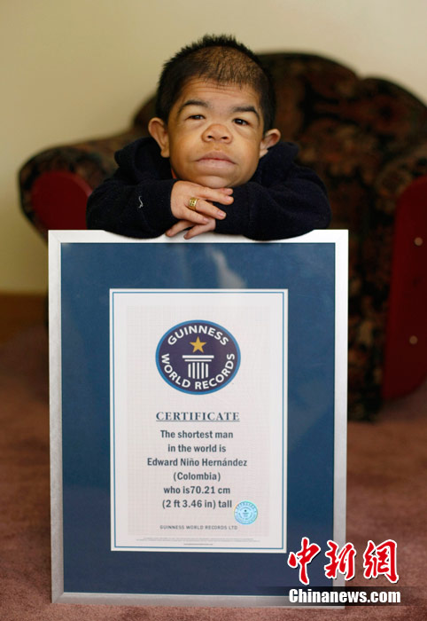 身高僅70厘米的哥倫比亞男子愛德華·尼科·埃爾南迪斯近期獲得吉尼斯世界紀(jì)錄世界最矮男人的稱號。身高為74厘米的前吉尼斯世界紀(jì)錄保持者何平平3月13日去世后,吉尼斯紀(jì)錄認(rèn)證官員找到了身高70厘米的埃爾南迪斯,F(xiàn)年24歲的他體重只有10公斤,出生時(shí)體重為1.5公斤,體長38厘米。然而,埃爾南迪斯的這個(gè)頭銜不會(huì)保持太久,尼泊爾少年馬加爾今年10月14日年滿18周歲后,有望取代他成為世界最矮的男人,馬加爾身高僅56厘米。