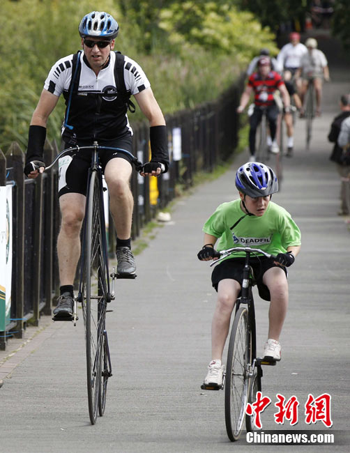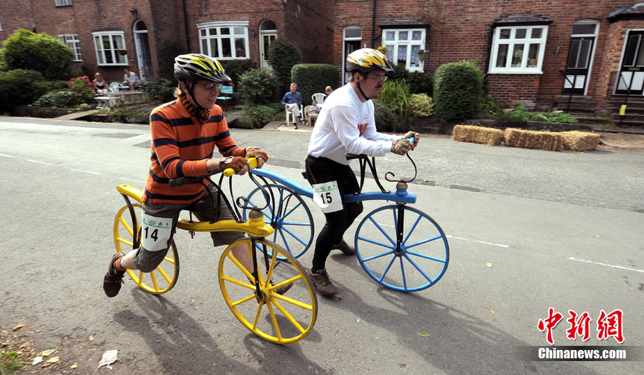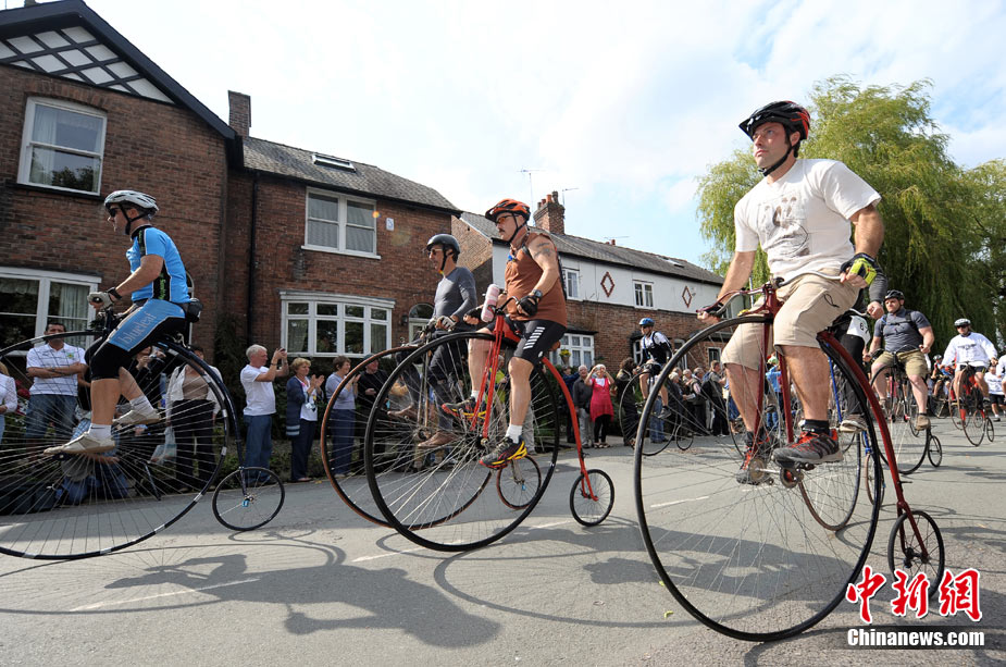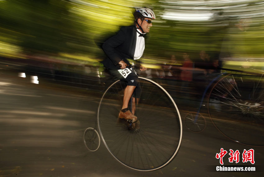 近日,英國(guó)大納茨福德舉行了復(fù)古自行車比賽。該項(xiàng)比賽每十年舉行一次,參賽者來自世界各地。他們須在三個(gè)小時(shí)的限時(shí)內(nèi)沿著一公里長(zhǎng)的賽道進(jìn)行騎行比賽。