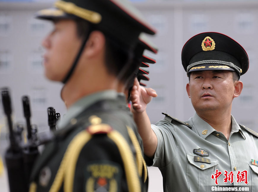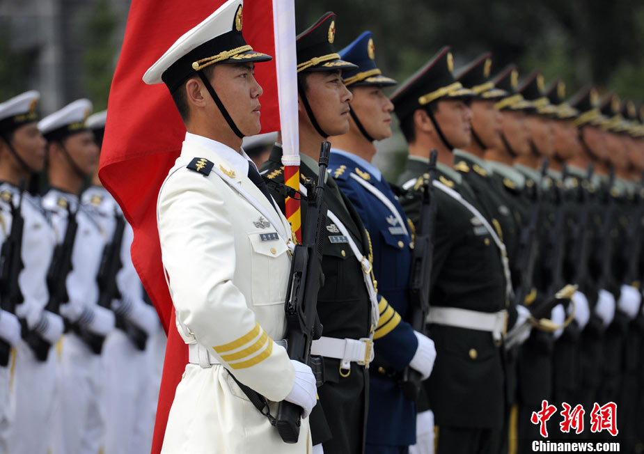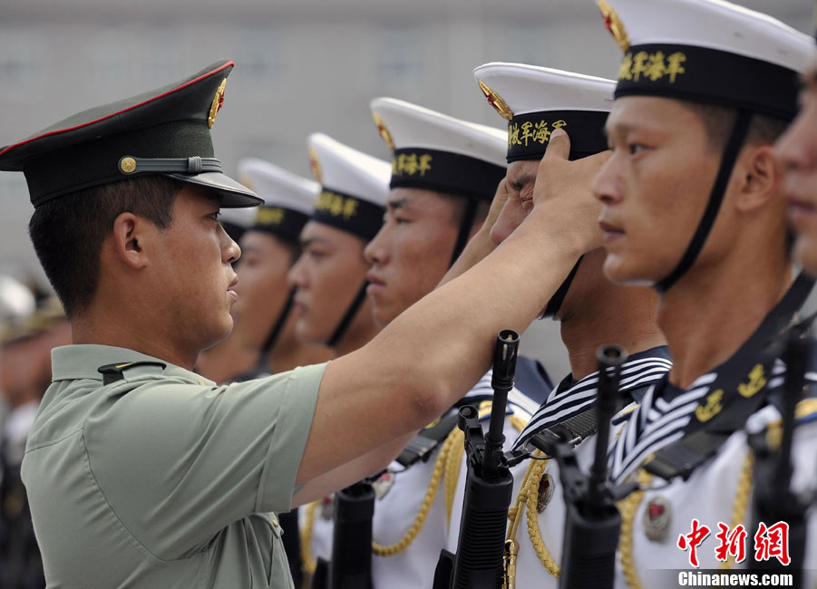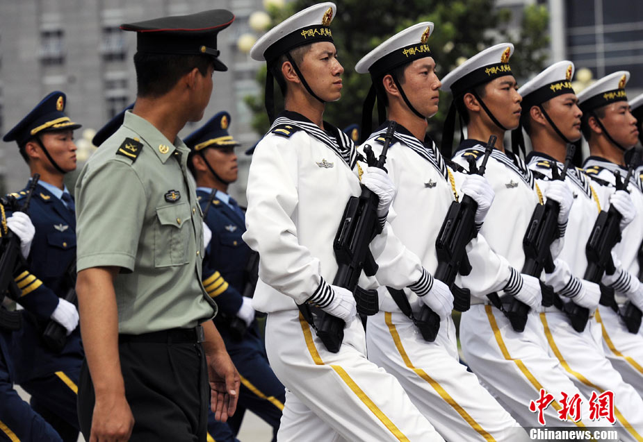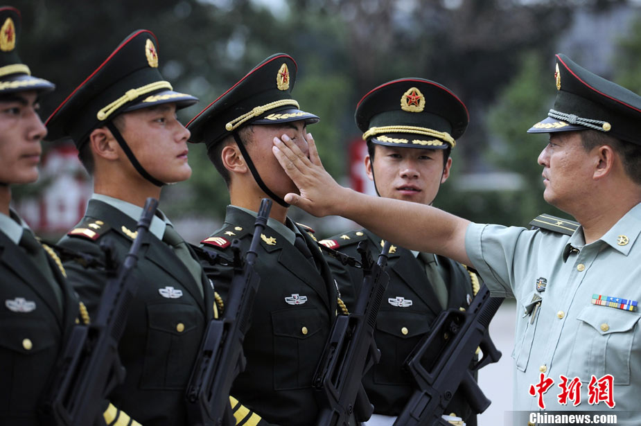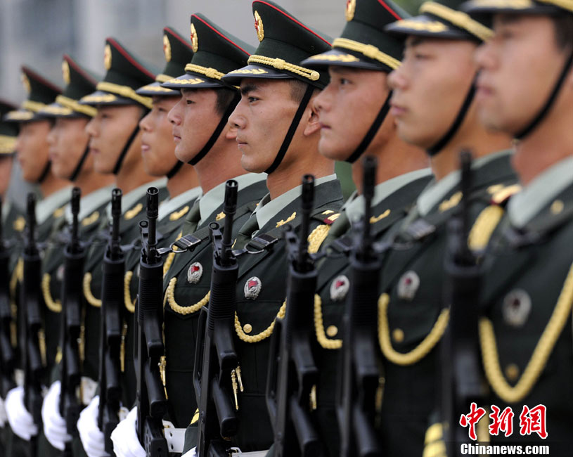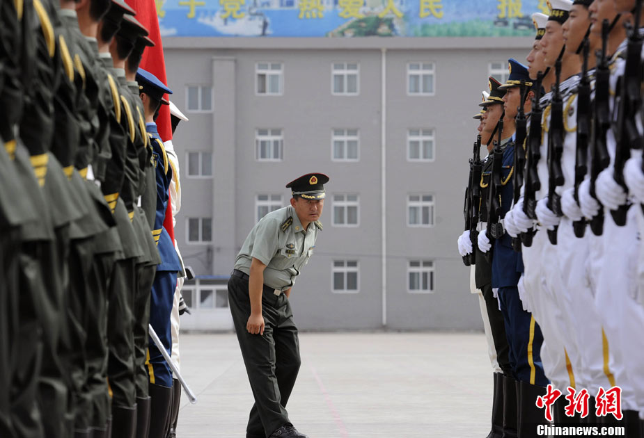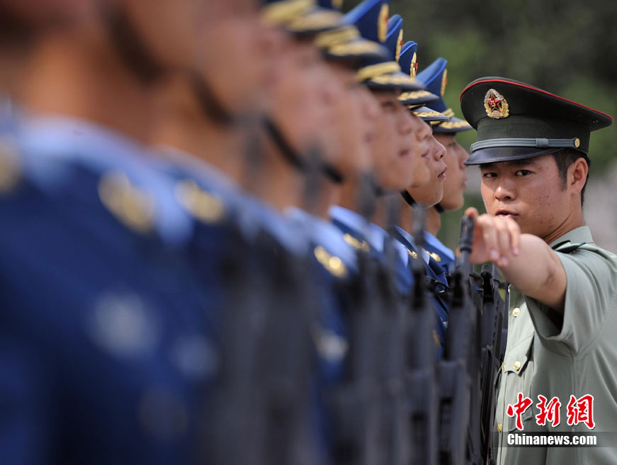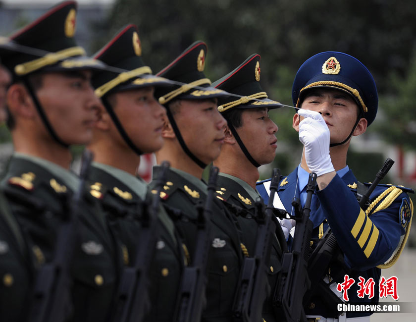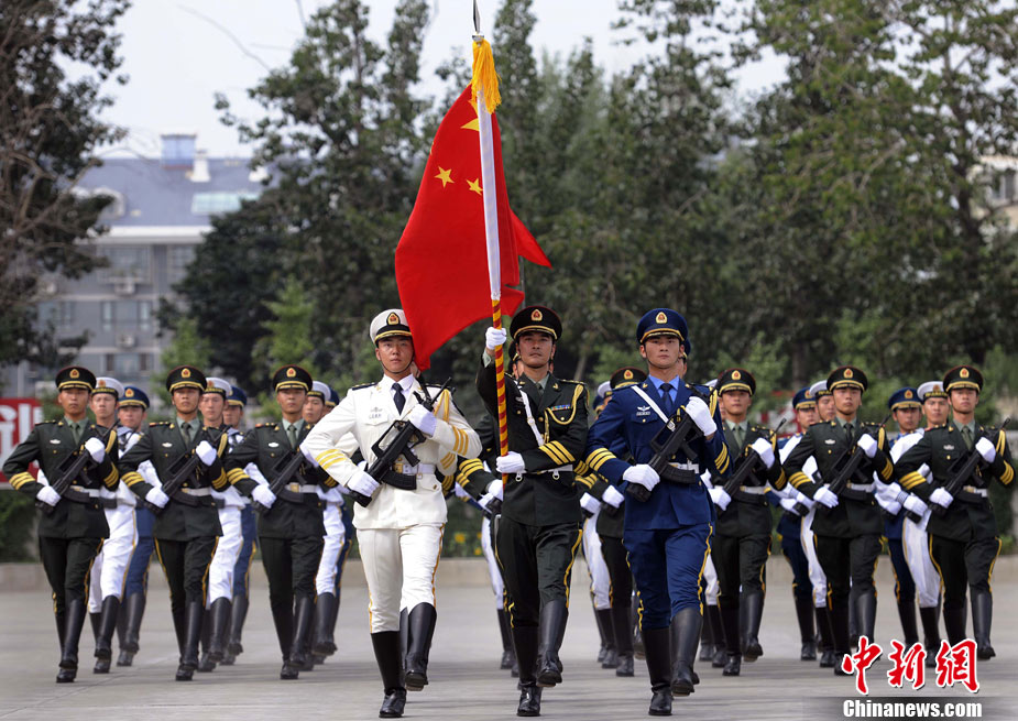 中國國防部9日宣布,應(yīng)墨西哥國防部邀請,由解放軍北京衛(wèi)戍區(qū)儀仗大隊選派36人組成的中國人民解放軍三軍儀仗方隊,今日從上海啟程赴墨西哥參加墨獨立200周年慶典閱兵。圖為近日中國人民解放軍陸海空三軍儀仗隊?wèi)?zhàn)士在駐地訓(xùn)練。中新社記者 劉震 攝