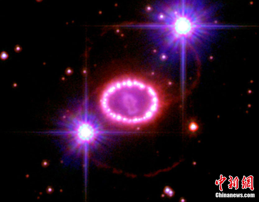 美國宇航局近日拍到一顆名為1987A的超新星爆發(fā)時(shí)形成的美麗“星膽”,而這場絢麗的爆發(fā)距離地球約16.3萬光年!靶悄憽敝袊@著超新星爆發(fā)后留下的30到40個(gè)閃亮的殘余物,形成一個(gè)直徑約9.6萬億公里的圓環(huán),酷似由一顆顆璀璨的珍珠串成的項(xiàng)鏈。