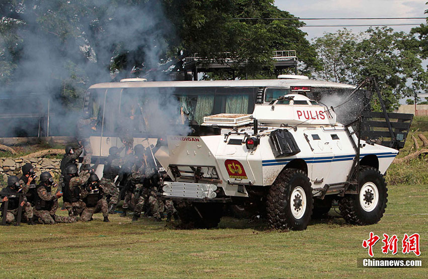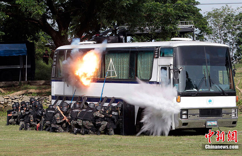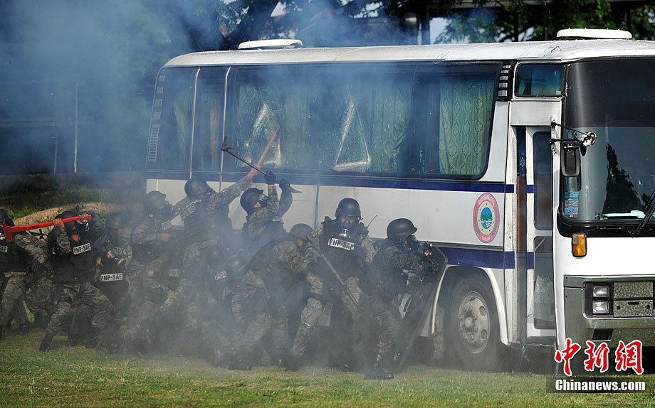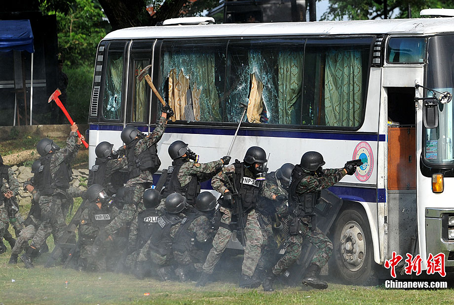 當(dāng)?shù)貢r(shí)間9月9日,菲律賓警察特別行動(dòng)部隊(duì)成員在菲律賓首都馬尼拉附近的營(yíng)地舉行了人質(zhì)救援演習(xí)。菲律賓總統(tǒng)阿基諾三世親自前往觀看該救援演習(xí)。