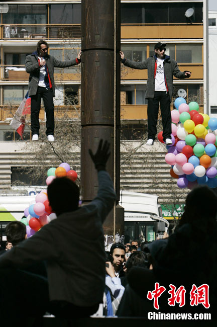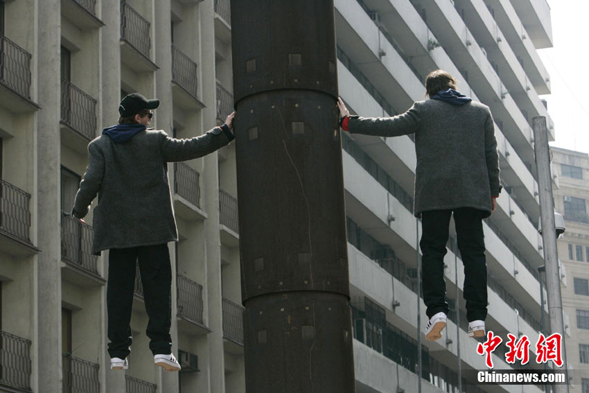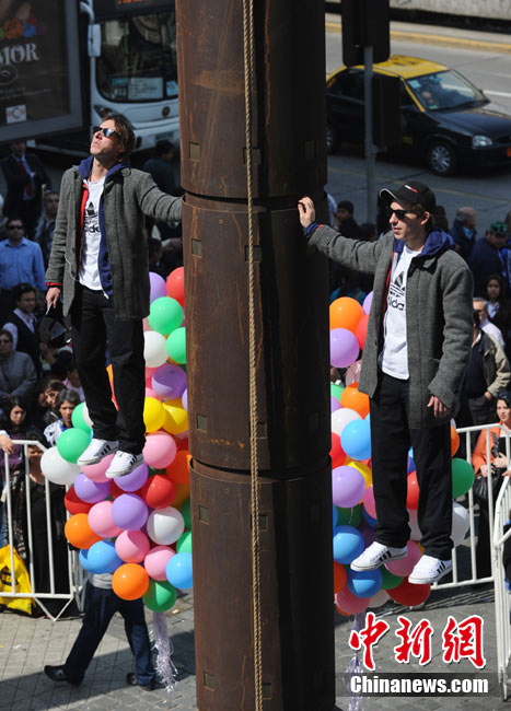 9月9日,智利著名的“魔術(shù)二人組”魔術(shù)師Jean Paul Olaverry和Nicolas Luisetti,在首都圣地亞哥街頭進行空中漂浮魔術(shù)。他們將在空中漂浮200分鐘以此來慶祝智利獨立200周年。